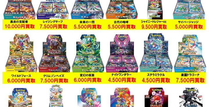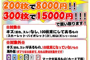 ポケモンカードの在庫が足りませんので、まとめ買取アップを開始しました! RR・S・ARを100枚束にしてお持ちいただくと、通常の買取からプラスアップいたします! 詳しい条件・対象外などの注意事項は画像をご確認ください! …