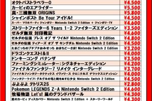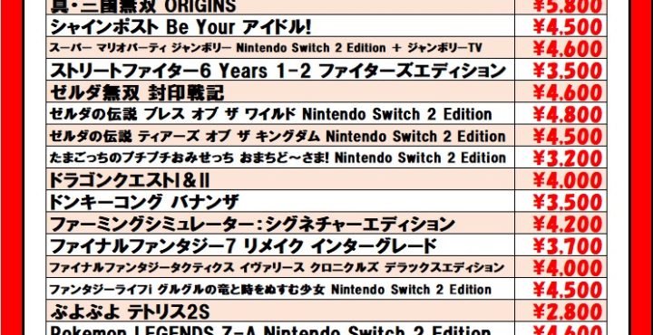Switch2、Switch、PS5、PS4ソフト買取情報更新しました! ※2026/1/12現在の価格となります。 在庫状況などによってお値段が変動いたします。予めご了承ください。 **************** こ…