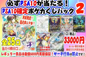 ポケカくじパック「PSA10確定くじパック」第2弾が販売開始です! 今回は1口33,000円、全25口! ポップに記載の当たり枠豪華景品は8口!月末につきいつもより還元率マシマシでご用意しております!!レギュラー景品は最…