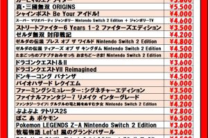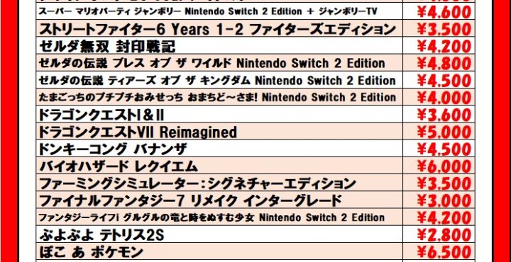Switch2、Switch、PS5、PS4ソフト買取情報更新しました! ※2026/2/22現在の価格となります。 在庫状況などによってお値段が変動いたします。予めご了承ください。 **************** こ…