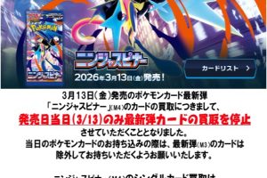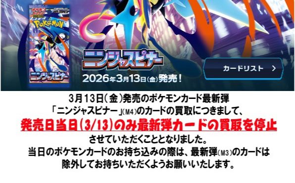 3/13(金)発売のポケモンカード最新弾「ニンジャスピナー」(M4)のカードの買取につきまして、発売日当日のみ最新弾カードの買取を停止させていただくこととなりました。 概要は画像にてご確認ください。 お客様にはご迷惑をお…