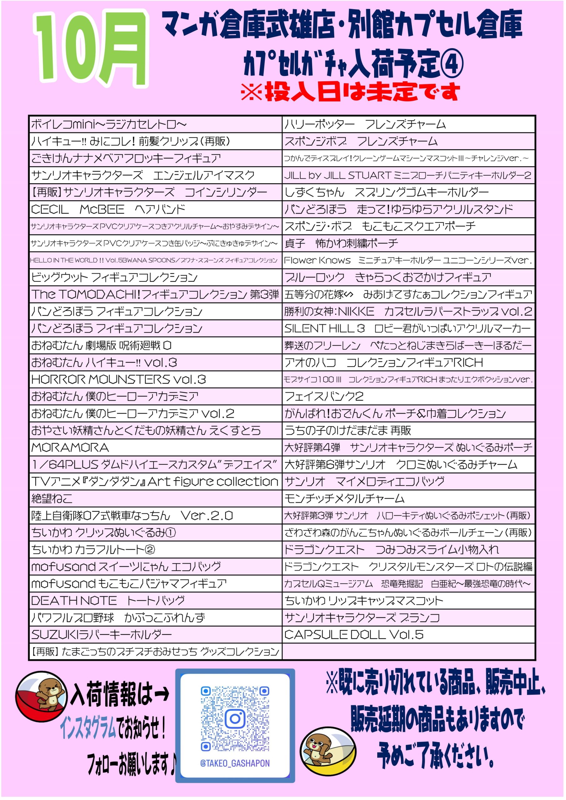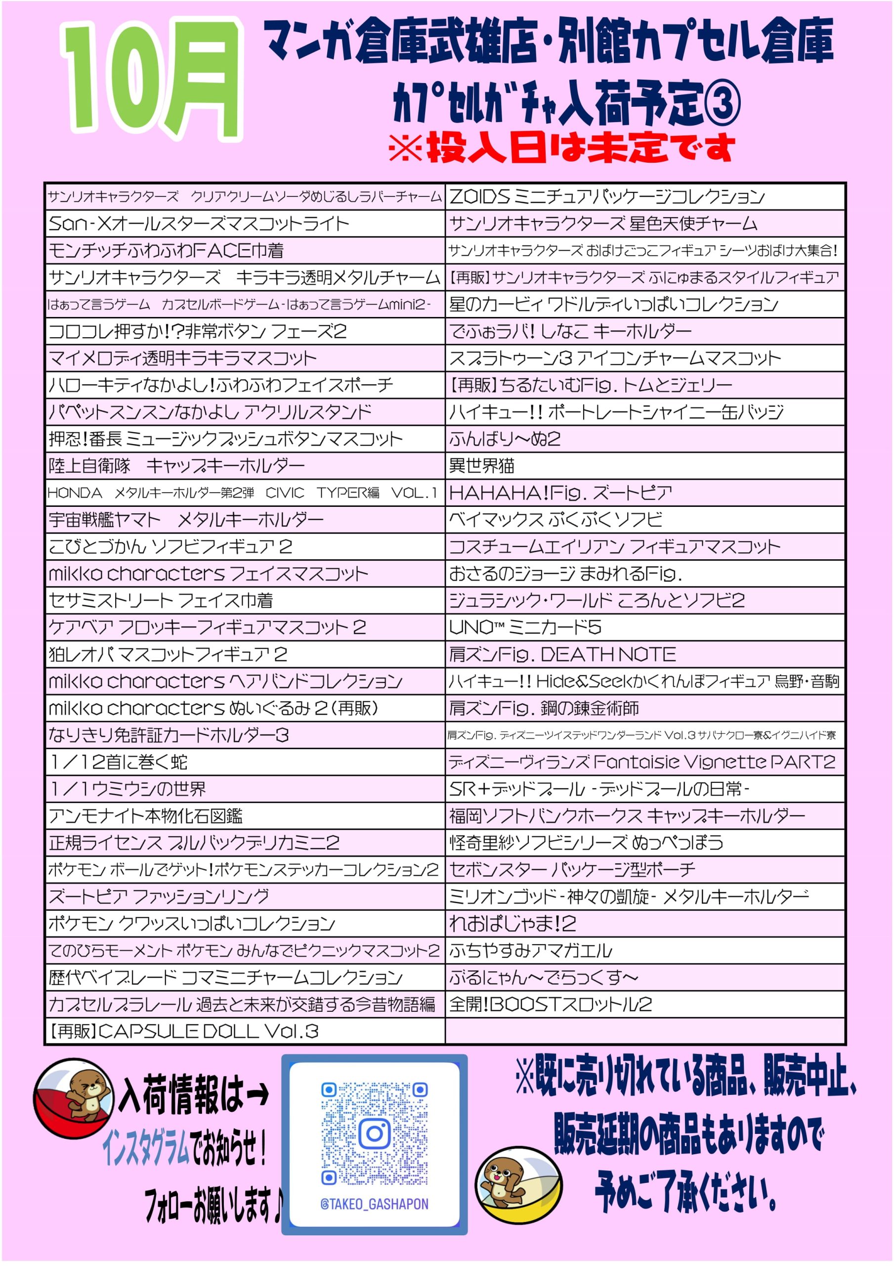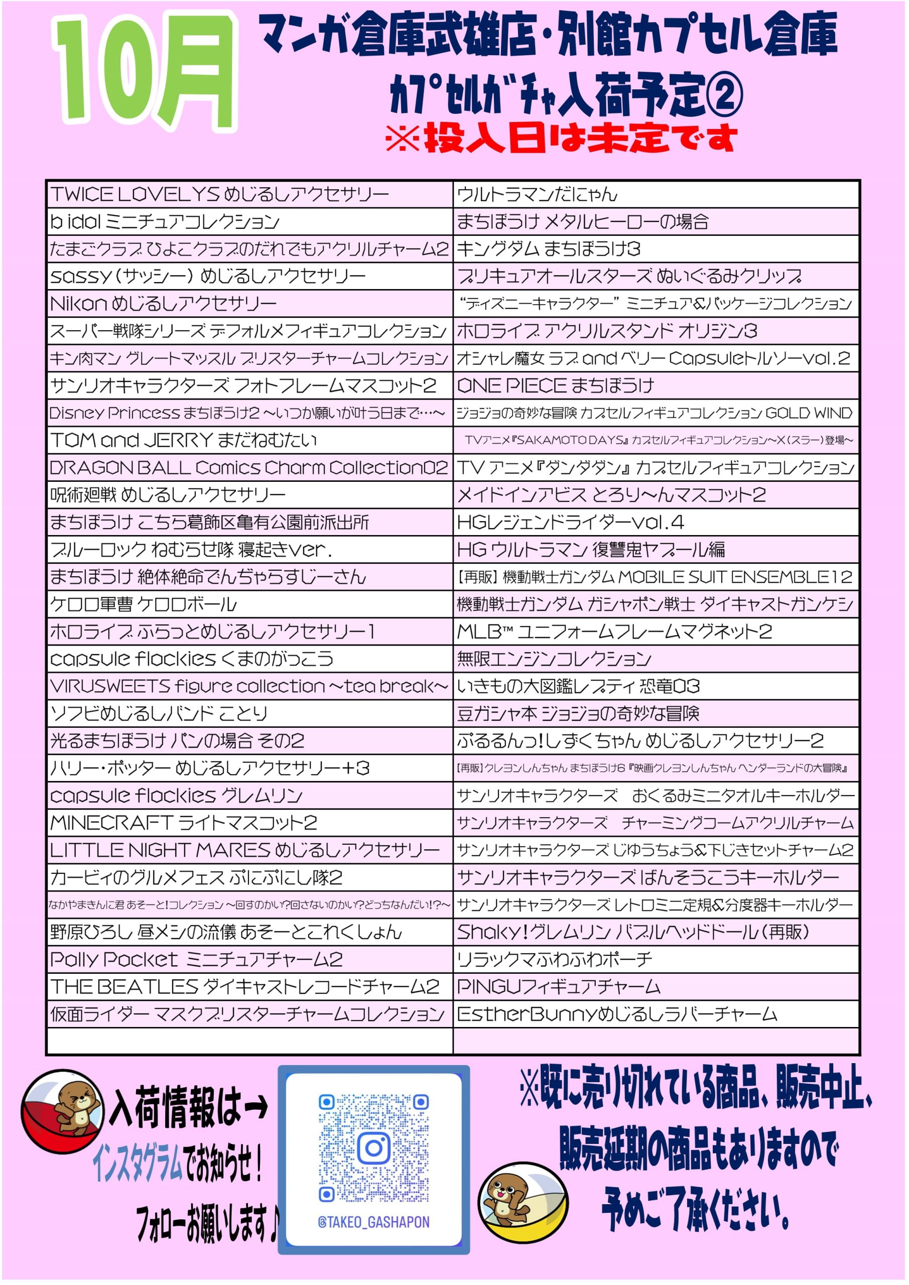2025.10.03 ガチャ takalab_2 ■10月カプセルガチャ◆#武雄カプセルガチャ■ Twitter Facebook はてブ LINE Pocket 10月のカプセルガチャ入荷予定のお知らせです! 入荷予定日、投入日は未定です。 ※既に売り切れている商品や、販売中止・延期になる商品もあります。お電話でのお問い合わせにもお答えできない可能性もあります。予めご了承ください。 入荷情報はInstagramをチェック‼️ この機会にぜひガチャガチャ回しにマンガ倉庫武雄店、別館カプセル倉庫へ…ご来店お待ちしてまーす。 シェア! Twitter Facebook はてブ LINE Pocket feedly