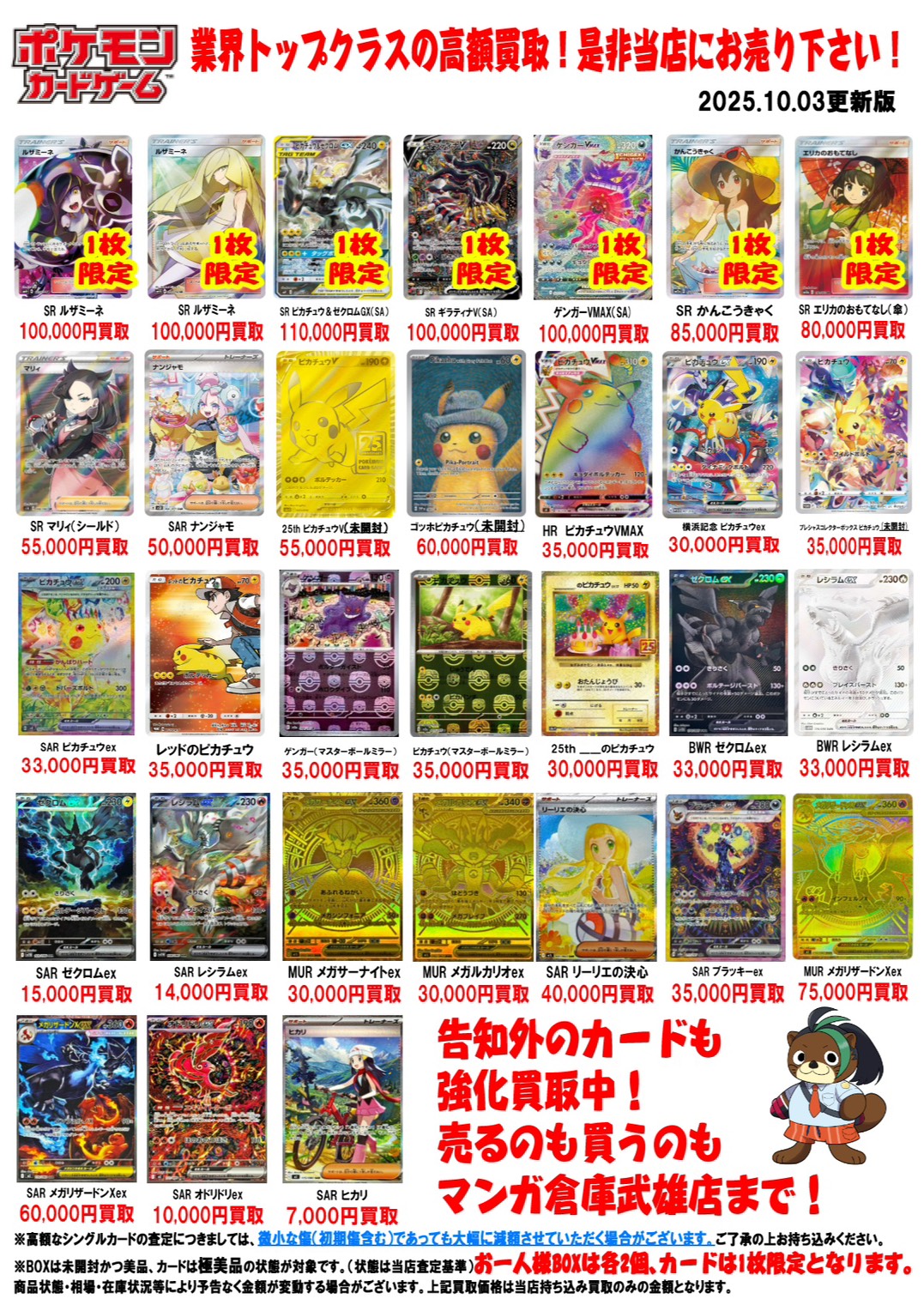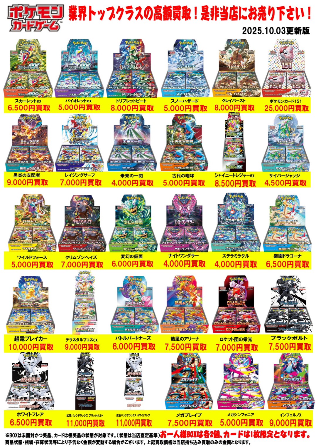 2025.10.03 買取情報 takalab_1 ポケモンカード買取告知更新しました! Twitter Facebook はてブ LINE Pocket ポケモンカード買取告知更新しました! ※2025/10/3現在の価格となります。 在庫状況などによってお値段が変動いたします。予めご了承ください。 **************** こちら↓もぜひチェックしてみてくださいね!(*´▽`*) ・最新のイベント情報はこちら ・最新の買取情報はこちら シェア! Twitter Facebook はてブ LINE Pocket feedly コメントを残す コメントをキャンセルメールアドレスが公開されることはありません。 ※ が付いている欄は必須項目ですコメント ※ 名前 ※ メール ※ サイト 新しいコメントをメールで通知 新しい投稿をメールで受け取る Δ このサイトはスパムを低減するために Akismet を使っています。コメントデータの処理方法の詳細はこちらをご覧ください。