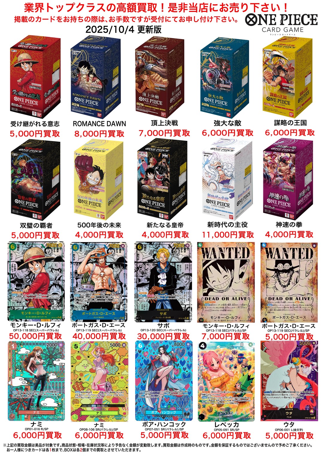 2025.10.04 買取情報 takalab_1 ワンピースカード買取告知更新しました! Twitter Facebook はてブ LINE Pocket ワンピースカード買取告知更新しました! ※2025/10/4現在の価格となります。 在庫状況などによってお値段が変動いたします。予めご了承ください。 **************** こちら↓もぜひチェックしてみてくださいね!(*´▽`*) ・最新のイベント情報はこちら ・最新の買取情報はこちら シェア! Twitter Facebook はてブ LINE Pocket feedly コメントを残す コメントをキャンセルメールアドレスが公開されることはありません。 ※ が付いている欄は必須項目ですコメント ※ 名前 ※ メール ※ サイト 新しいコメントをメールで通知 新しい投稿をメールで受け取る Δ このサイトはスパムを低減するために Akismet を使っています。コメントデータの処理方法の詳細はこちらをご覧ください。