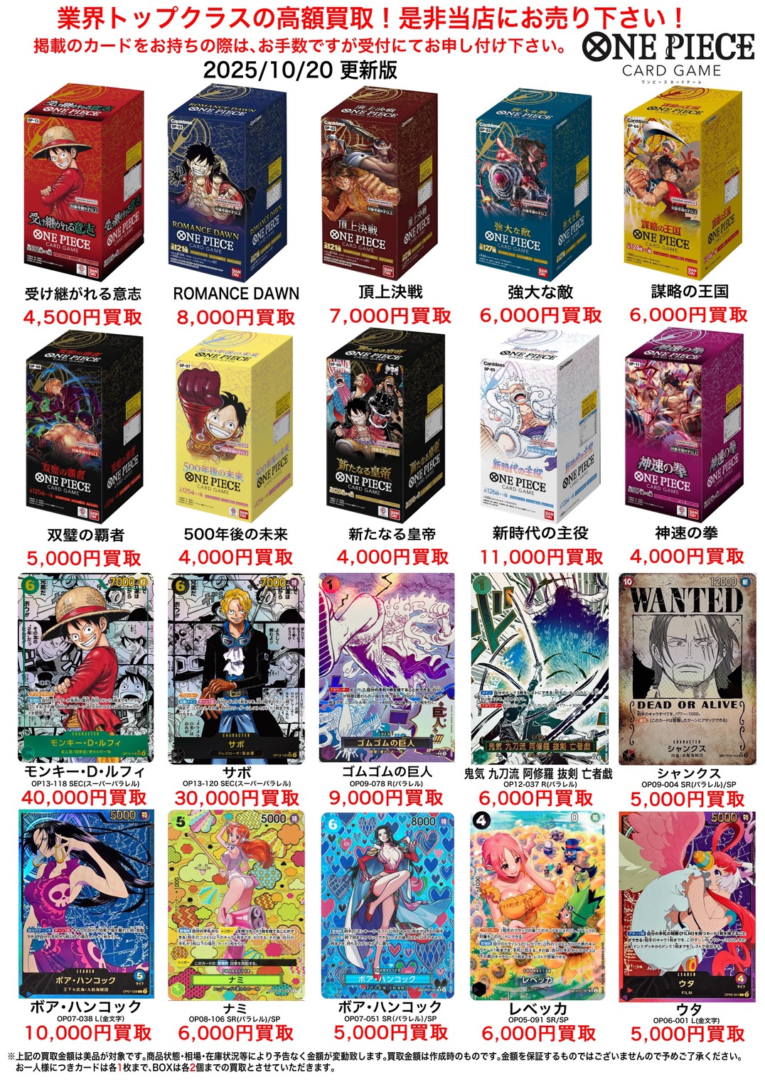 2025.10.21 買取情報 takalab_2 ★ワンピースカード買取告知★ Twitter Facebook はてブ LINE Pocket ★買取情報★ ※2025/10/21現在の価格となります。 在庫状況などによってお値段が変動いたします。予めご了承ください。 **************** こちら↓もぜひチェックしてみてくださいね!(*´▽`*) ・最新のイベント情報はこちら ・最新の買取情報はこちら シェア! Twitter Facebook はてブ LINE Pocket feedly コメントを残す コメントをキャンセルメールアドレスが公開されることはありません。 ※ が付いている欄は必須項目ですコメント ※ 名前 ※ メール ※ サイト 新しいコメントをメールで通知 新しい投稿をメールで受け取る Δ このサイトはスパムを低減するために Akismet を使っています。コメントデータの処理方法の詳細はこちらをご覧ください。
