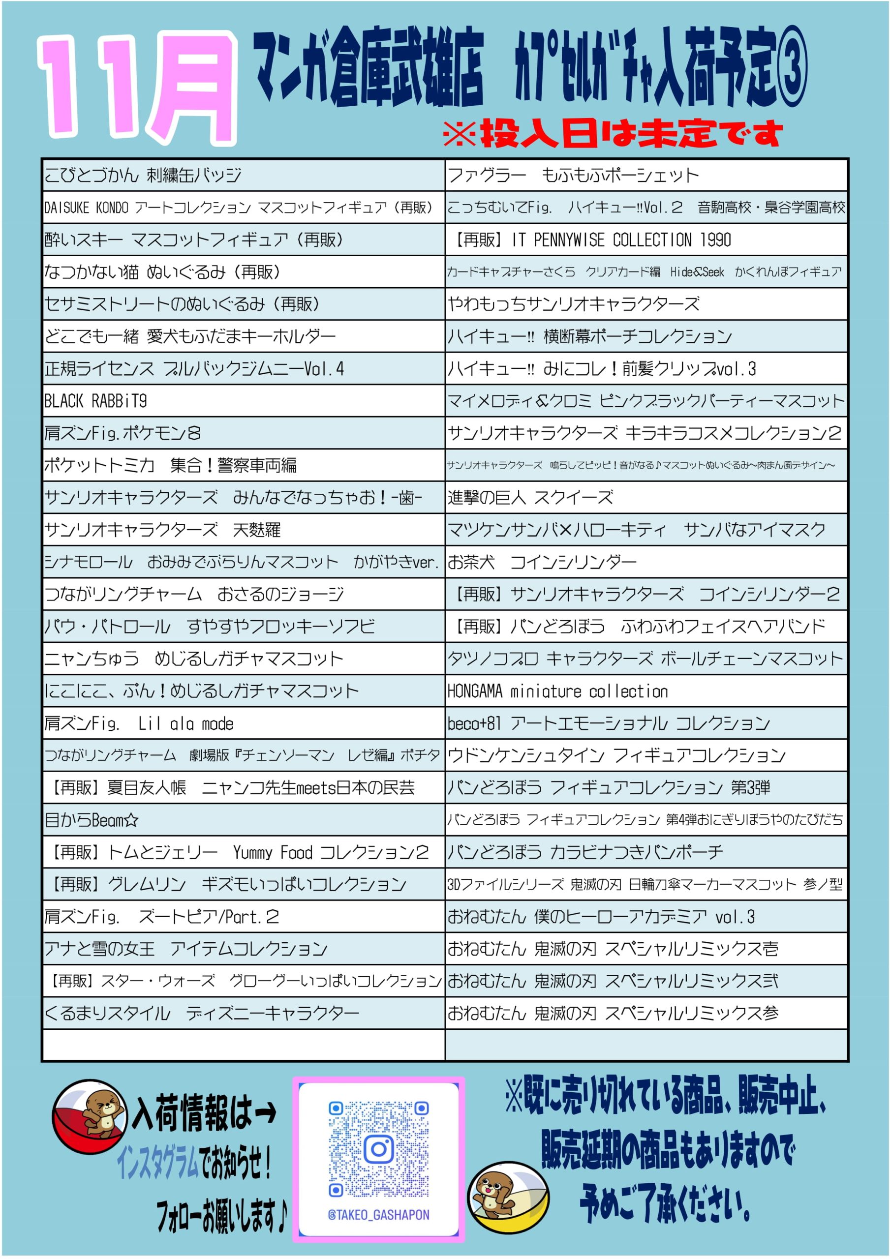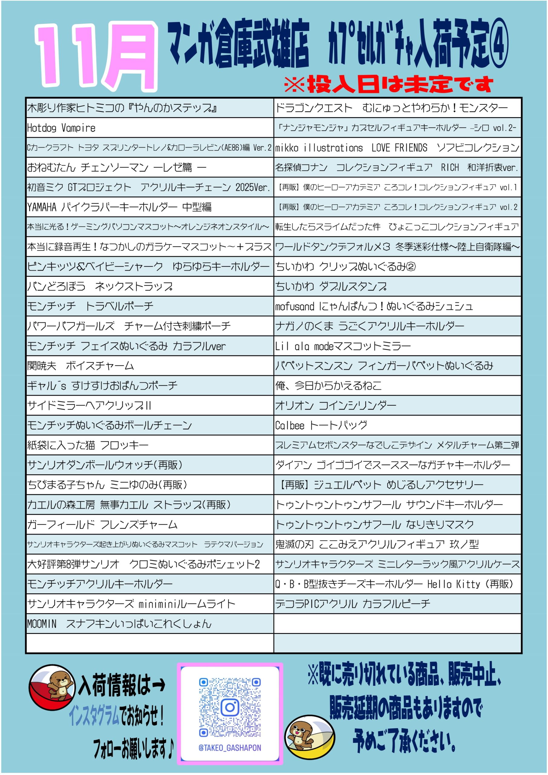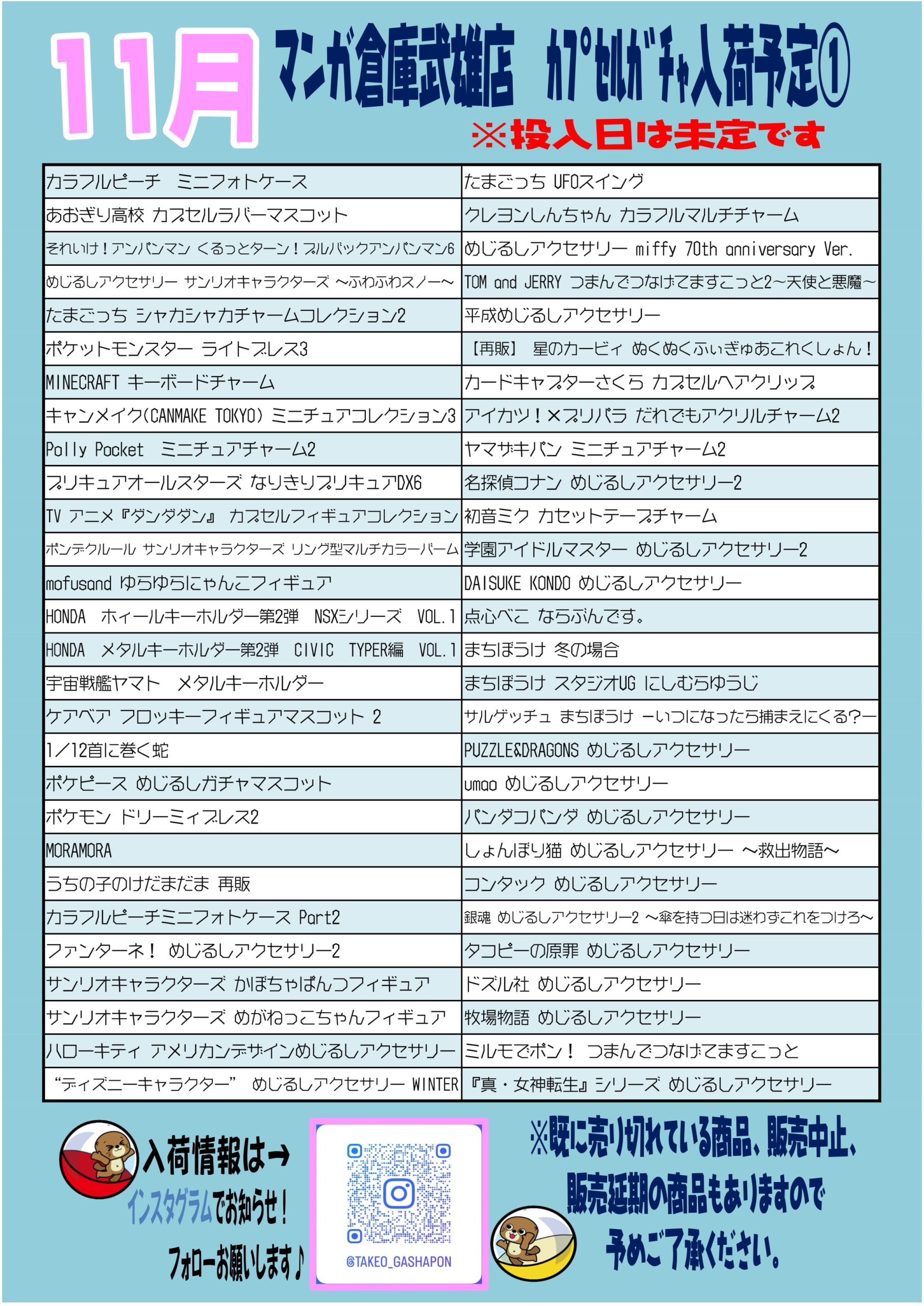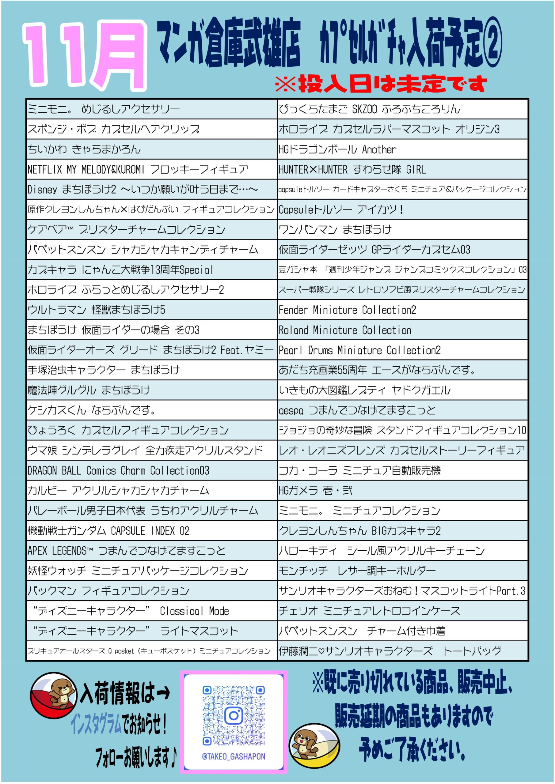 2025.11.02 ガチャ takalab_4 ■11月カプセルガチャ■ #武雄カプセルガチャ #ガチャガチャ #カプセルガチャ入荷 Twitter Facebook はてブ LINE Pocket 11月のカプセルガチャ入荷予定のお知らせです! 今月も人気ガチャたくさん入荷しまーす! 入荷予定日、投入日は未定です。 インスタにて入荷情報お知らせしています。 ※既に売り切れている商品や、販売中止・延期になる商品もありますので、予めご了承ください。 この機会にぜひガチャガチャ回しにマンガ倉庫武雄店へ❗️お待ちしてまーす。 シェア! Twitter Facebook はてブ LINE Pocket feedly