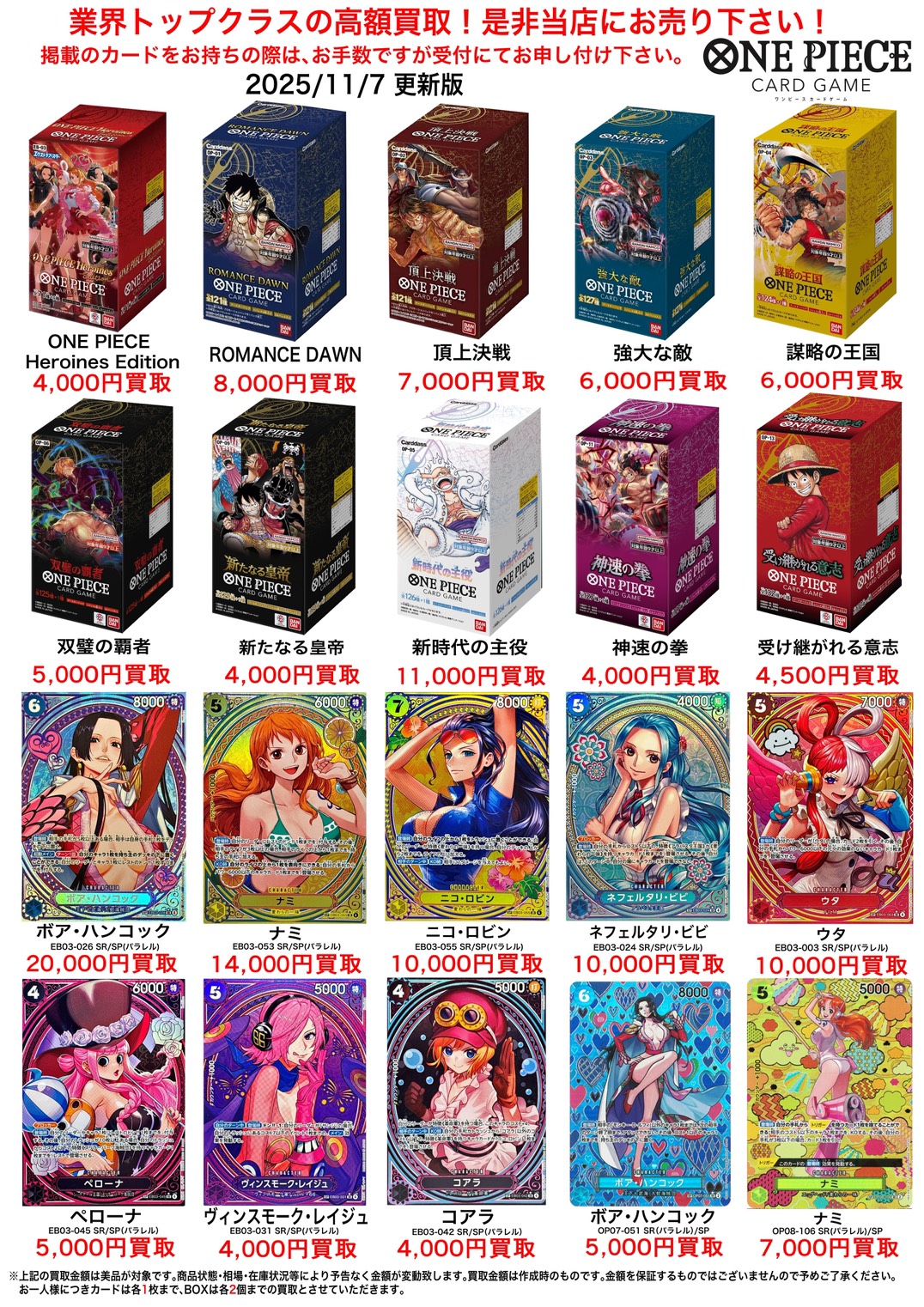 2025.11.07 買取情報 takalab_6 ◆ワンピースカードゲーム 買取情報更新しました!◆ Twitter Facebook はてブ LINE Pocket 買取情報📣 ※2025/10/7現在の価格となります。 在庫状況などによってお値段が変動いたします。予めご了承ください。 **************** こちら↓もぜひチェックしてみてくださいね!(*´▽`*) ・最新のイベント情報はこちら ・最新の買取情報はこちら シェア! Twitter Facebook はてブ LINE Pocket feedly コメントを残す コメントをキャンセルメールアドレスが公開されることはありません。 ※ が付いている欄は必須項目ですコメント ※ 名前 ※ メール ※ サイト 新しいコメントをメールで通知 新しい投稿をメールで受け取る Δ このサイトはスパムを低減するために Akismet を使っています。コメントデータの処理方法の詳細はこちらをご覧ください。