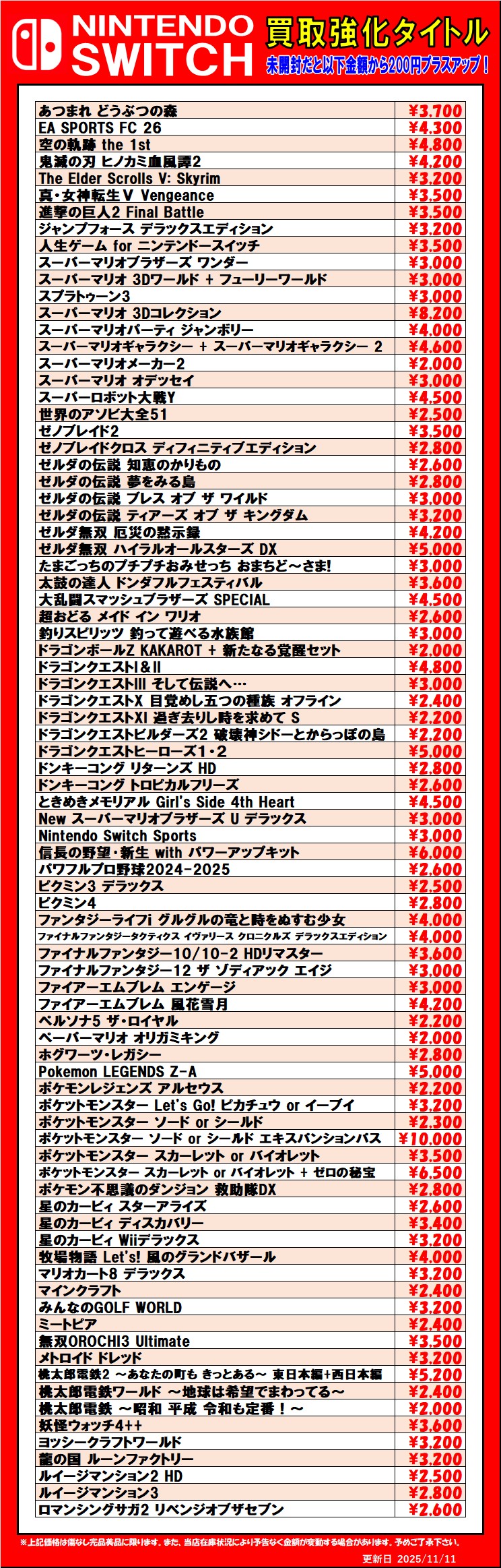 2025.11.11 買取情報 takalab_6 ◆Switch2、Switch、PS5、PS4ソフト買取情報更新しました!◆ #ゲーム #買取 #佐賀 #武雄 #PS4 #PS5 #Switch #Switch2 #バトルフィールド6 #ゼルダ無双 封印戦記 #ポケモンZA #桃太郎電鉄2 Twitter Facebook はてブ LINE Pocket 🎮買取情報 ※2025/11/11現在の価格となります。 在庫状況などによってお値段が変動いたします。予めご了承ください。 **************** こちら↓もぜひチェックしてみてくださいね!(*´▽`*) ・最新のイベント情報はこちら ・最新の買取情報はこちら シェア! Twitter Facebook はてブ LINE Pocket feedly コメントを残す コメントをキャンセルメールアドレスが公開されることはありません。 ※ が付いている欄は必須項目ですコメント ※ 名前 ※ メール ※ サイト 新しいコメントをメールで通知 新しい投稿をメールで受け取る Δ このサイトはスパムを低減するために Akismet を使っています。コメントデータの処理方法の詳細はこちらをご覧ください。