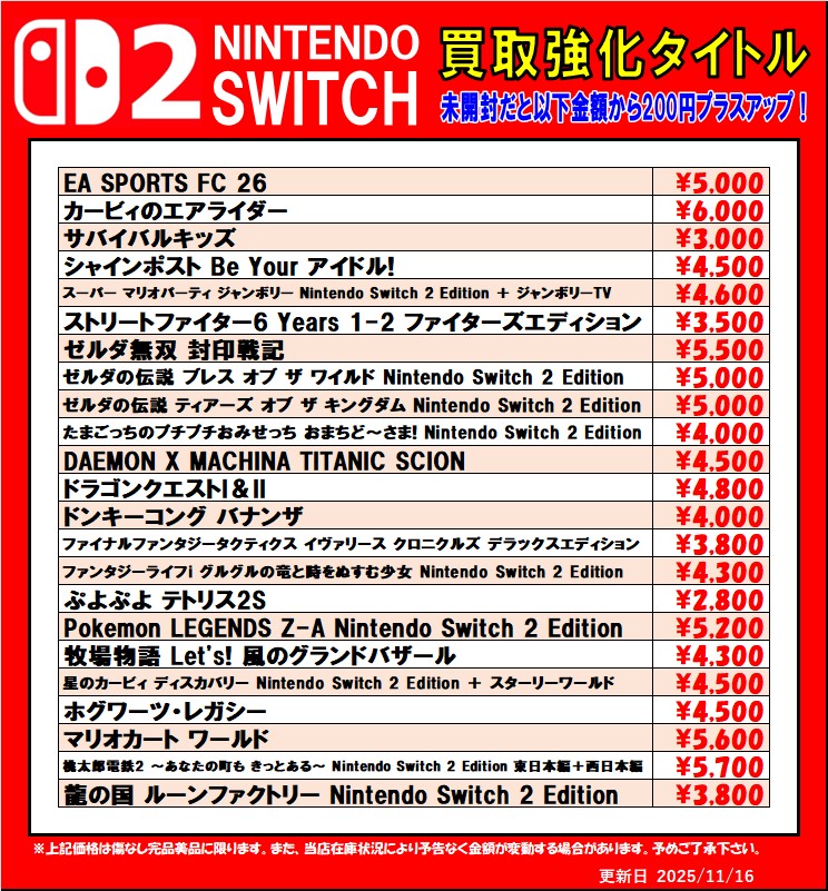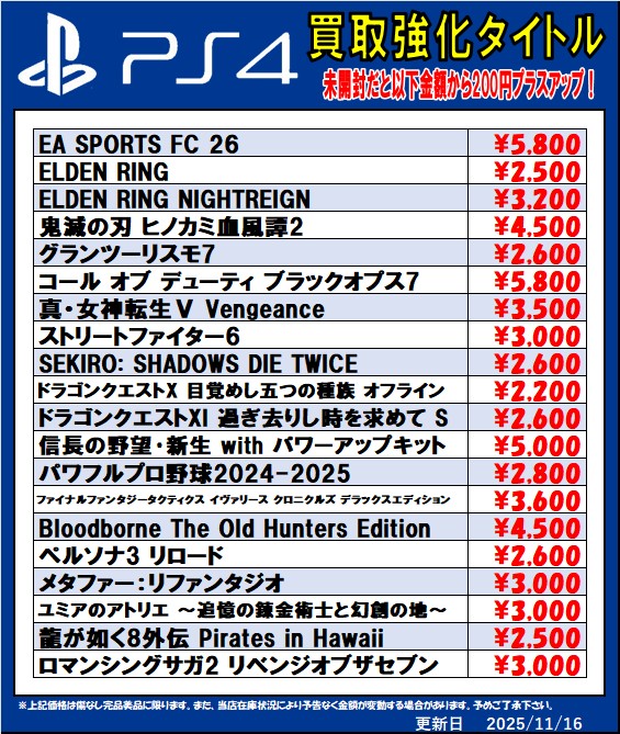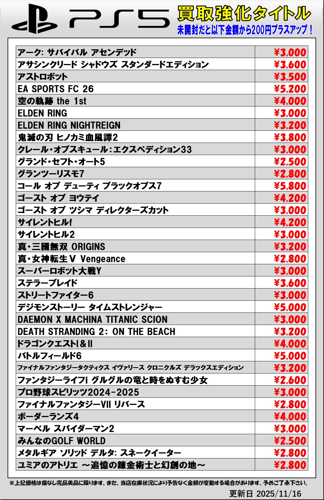 2025.11.16 買取情報 takalab_5 ◆Switch2、Switch、PS5、PS4ソフト買取情報更新しました!◆ #ゲーム #買取 #佐賀 #武雄 #PS4 #PS5 #Switch #Switch2 #ゼルダ無双 封印戦記 #エアライダー #桃太郎電鉄2 Twitter Facebook はてブ LINE Pocket 🎮買取情報 ※2025/11/16現在の価格となります。 在庫状況などによってお値段が変動いたします。予めご了承ください。 **************** こちら↓もぜひチェックしてみてくださいね!(*´▽`*) ・最新のイベント情報はこちら ・最新の買取情報はこちら シェア! Twitter Facebook はてブ LINE Pocket feedly コメントを残す コメントをキャンセルメールアドレスが公開されることはありません。 ※ が付いている欄は必須項目ですコメント ※ 名前 ※ メール ※ サイト 新しいコメントをメールで通知 新しい投稿をメールで受け取る Δ このサイトはスパムを低減するために Akismet を使っています。コメントデータの処理方法の詳細はこちらをご覧ください。