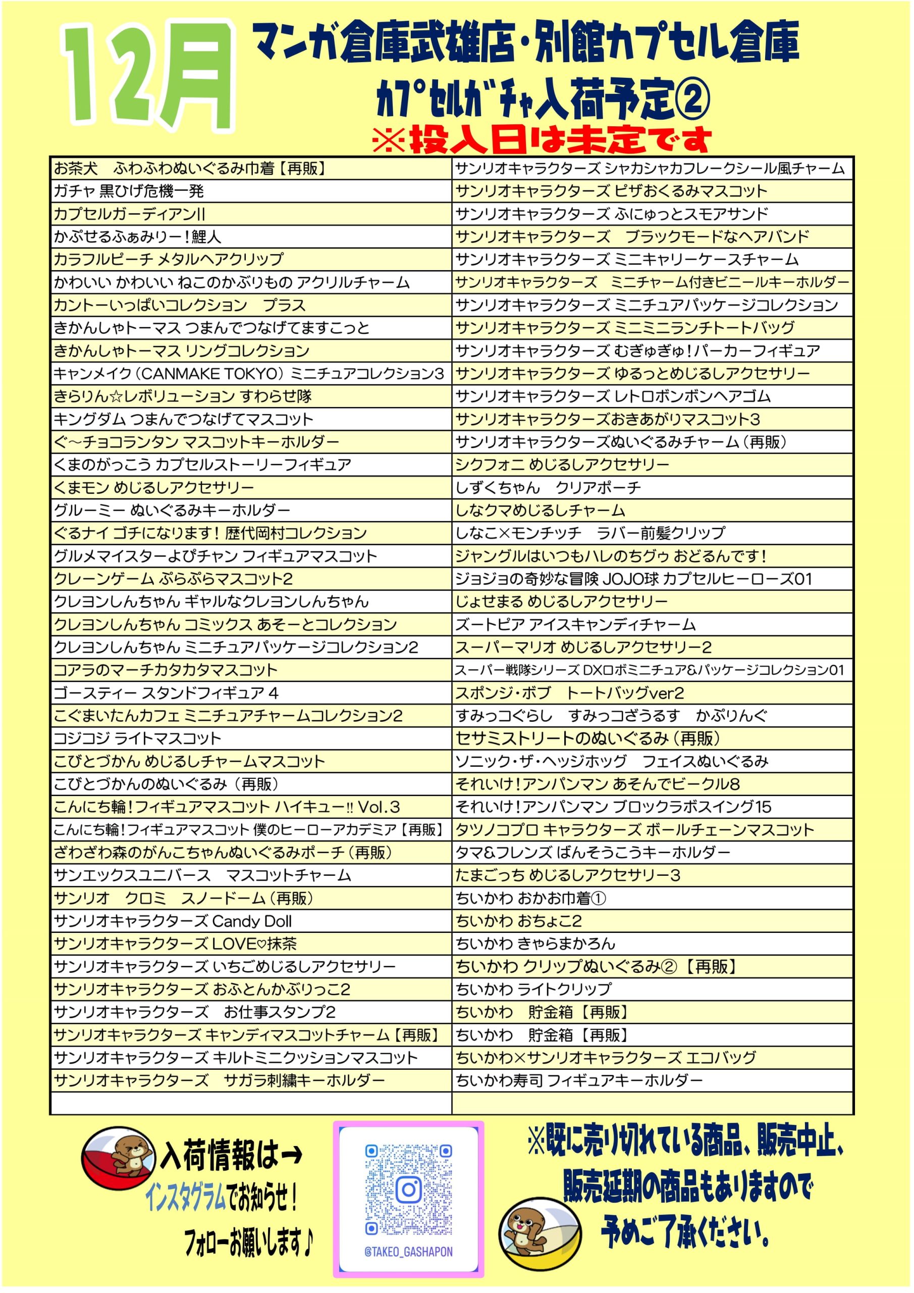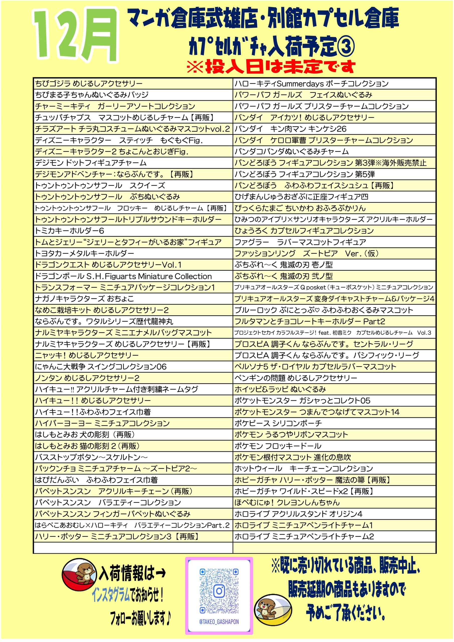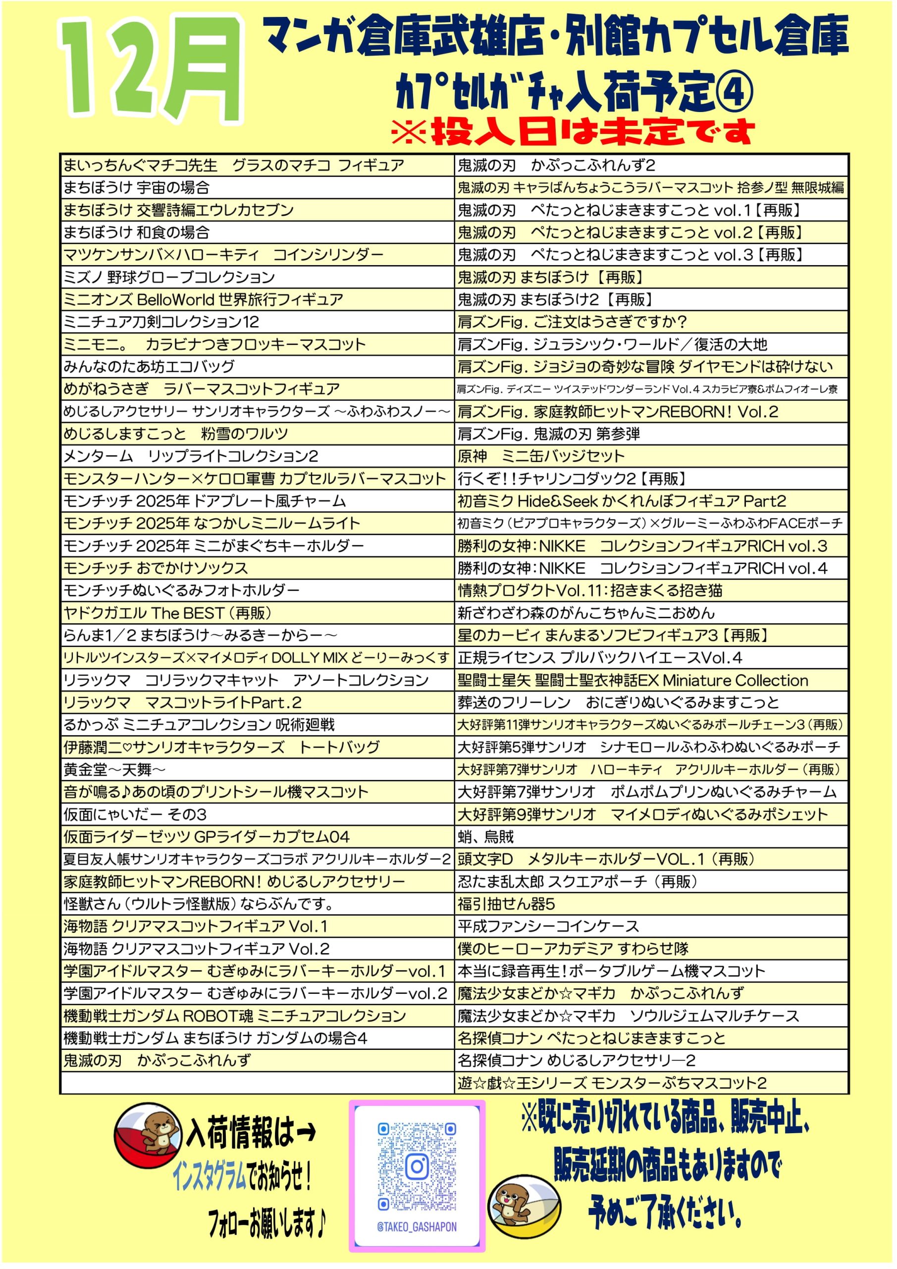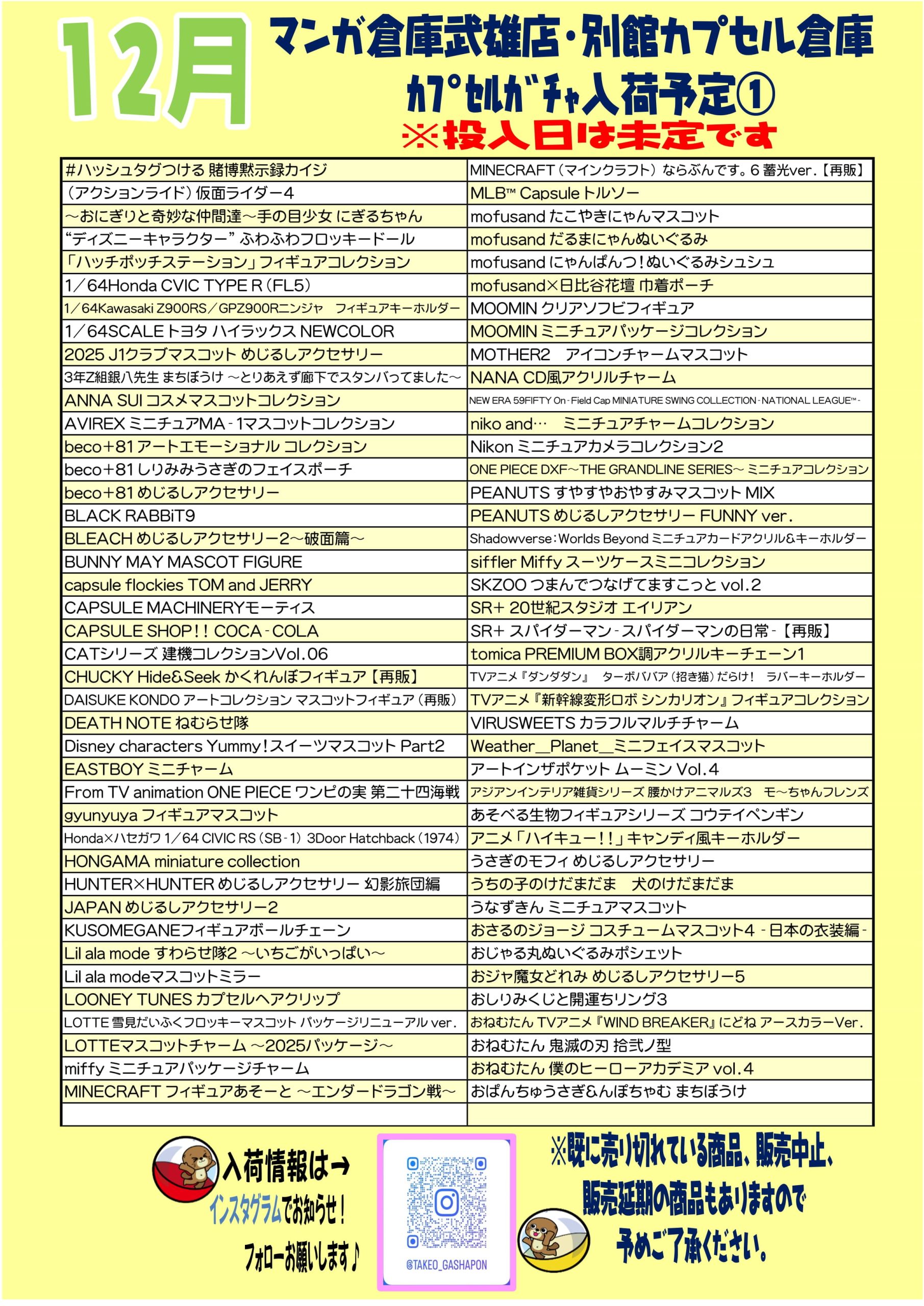 2025.12.05 アミューズ takalab_4 ■12月カプセルガチャ■ #武雄カプセルガチャ #カプセル倉庫 #マンガ倉庫 #ガチャガチャ #入荷予定 Twitter Facebook はてブ LINE Pocket 12月のカプセルガチャ入荷予定のお知らせです! 今月もじゃんじゃん入荷しちゃいます。 入荷予定日、投入日は未定となっています。 ※既に売り切れている商品や、回数制限を儲けさせていただく商品、販売中止・延期になる商品もありますので、予めご了承ください。 この機会にぜひガチャガチャ地域1番マンガ倉庫武雄店へ回しに来てください!お待ちしてまーす。 シェア! Twitter Facebook はてブ LINE Pocket feedly
