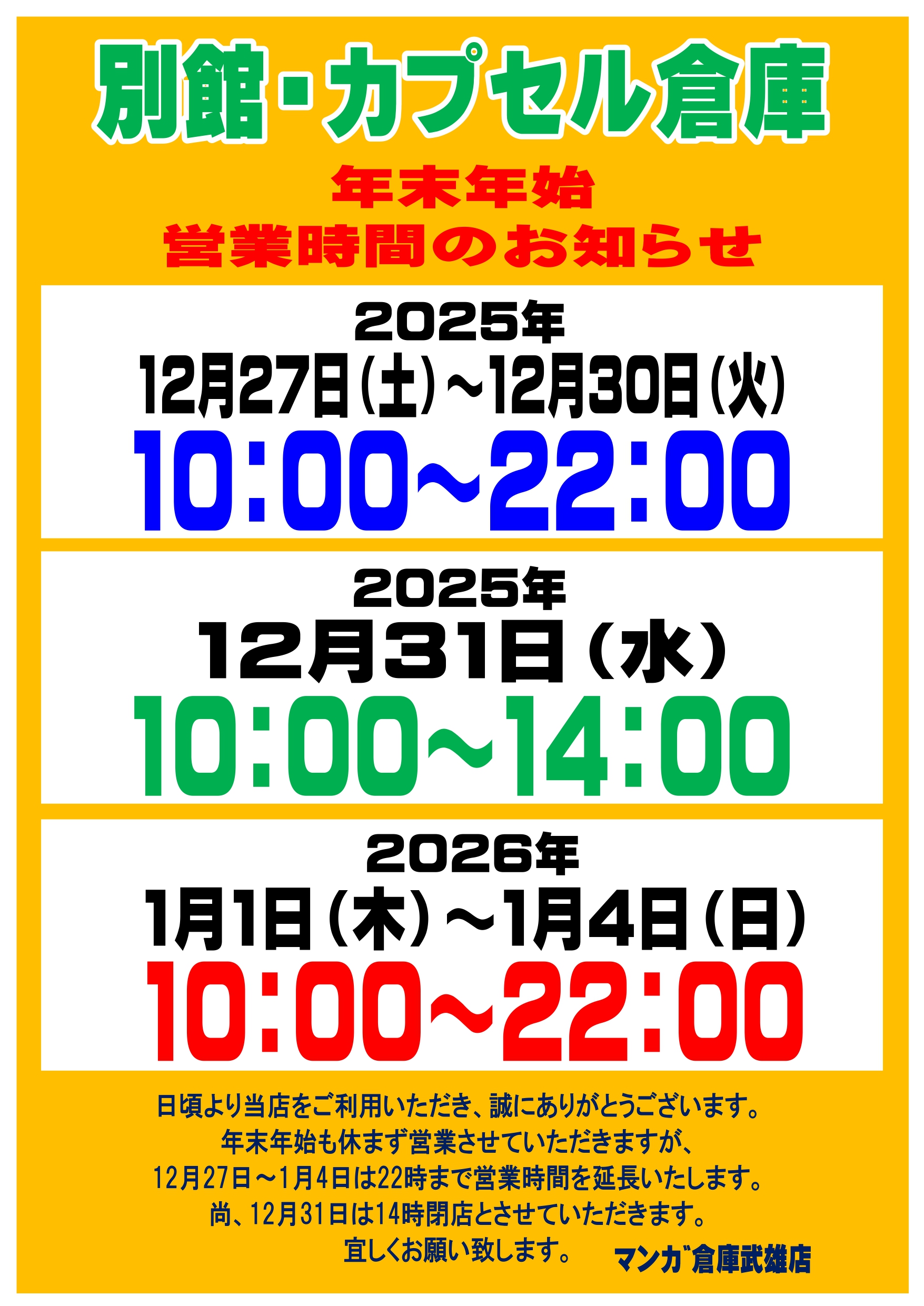 2025.12.26 お知らせ takalab_1 別館・カプセル倉庫年末年始の営業時間のお知らせ#武雄カプセルガチャ #カプセル倉庫 #マンガ倉庫 #ガチャガチャ Twitter Facebook はてブ LINE Pocket 日頃より当店をご利用いただき、誠にありがとうございます。 年末年始も休まず営業いたします。 12月27日~1月4日は22時まで営業時間を延長いたします。 なお、12月31日は14時閉店とさせていただきます。 何卒よろしくお願いいたします。 シェア! Twitter Facebook はてブ LINE Pocket feedly