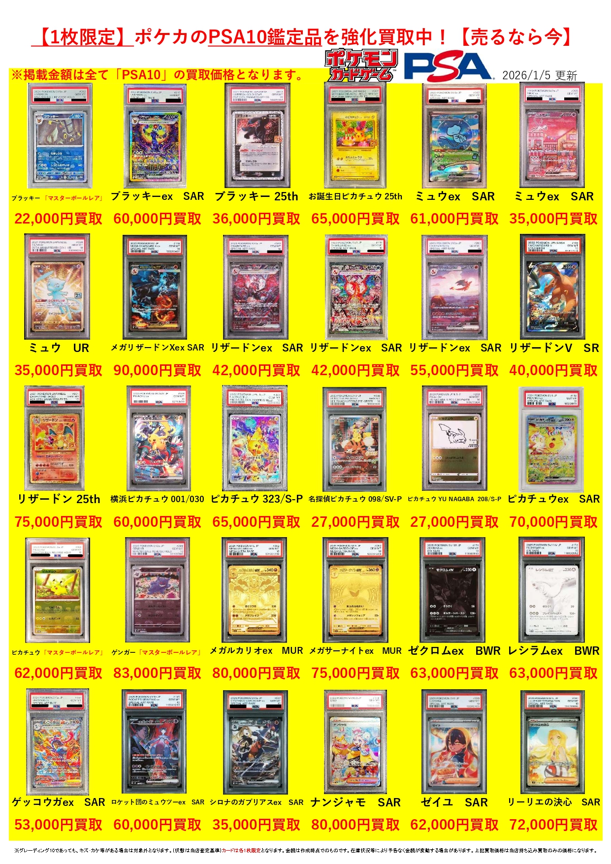 2026.01.05 買取情報 takalab_1 ★ポケモンカードPSA買取告知★ Twitter Facebook はてブ LINE Pocket ★買取情報★ ※2026/1/5現在の価格となります。 在庫状況などによってお値段が変動いたします。予めご了承ください。 **************** こちら↓もぜひチェックしてみてくださいね!(*´▽`*) ・最新のイベント情報はこちら ・最新の買取情報はこちら シェア! Twitter Facebook はてブ LINE Pocket feedly コメントを残す コメントをキャンセルメールアドレスが公開されることはありません。 ※ が付いている欄は必須項目ですコメント ※ 名前 ※ メール ※ サイト 新しいコメントをメールで通知 新しい投稿をメールで受け取る Δ このサイトはスパムを低減するために Akismet を使っています。コメントデータの処理方法の詳細はこちらをご覧ください。