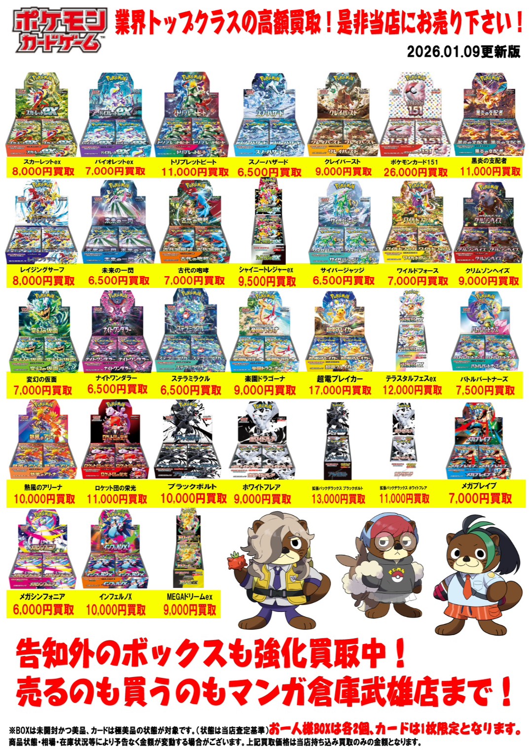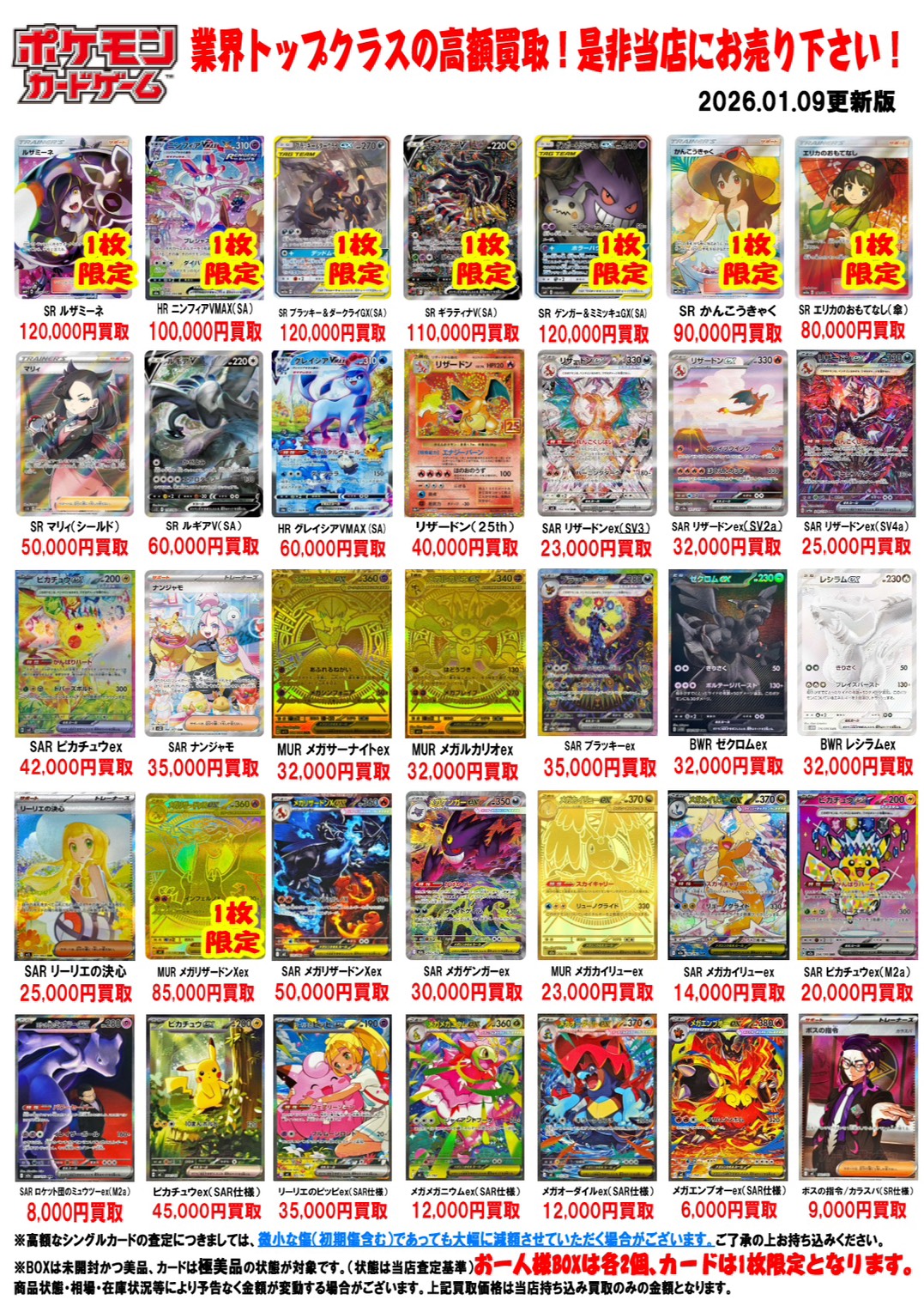 2026.01.09 買取情報 takalab_1 ポケモンカード買取告知更新しました! Twitter Facebook はてブ LINE Pocket ポケモンカード買取告知更新しました! ※2026/1/9現在の価格となります。 在庫状況などによってお値段が変動いたします。予めご了承ください。 **************** こちら↓もぜひチェックしてみてくださいね!(*´▽`*) ・最新のイベント情報はこちら ・最新の買取情報はこちら シェア! Twitter Facebook はてブ LINE Pocket feedly コメントを残す コメントをキャンセルメールアドレスが公開されることはありません。 ※ が付いている欄は必須項目ですコメント ※ 名前 ※ メール ※ サイト 新しいコメントをメールで通知 新しい投稿をメールで受け取る Δ このサイトはスパムを低減するために Akismet を使っています。コメントデータの処理方法の詳細はこちらをご覧ください。