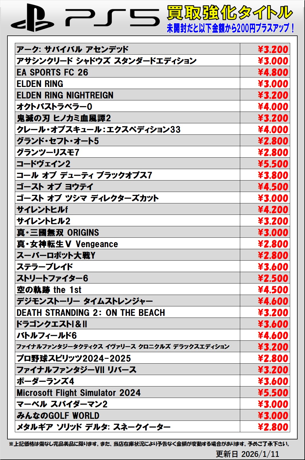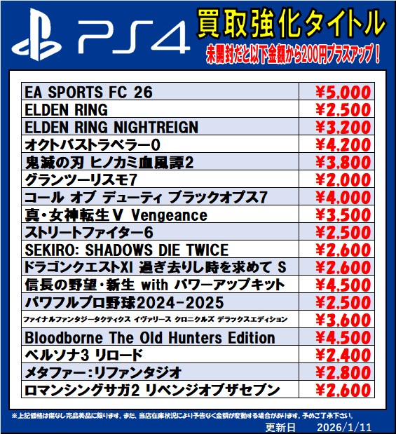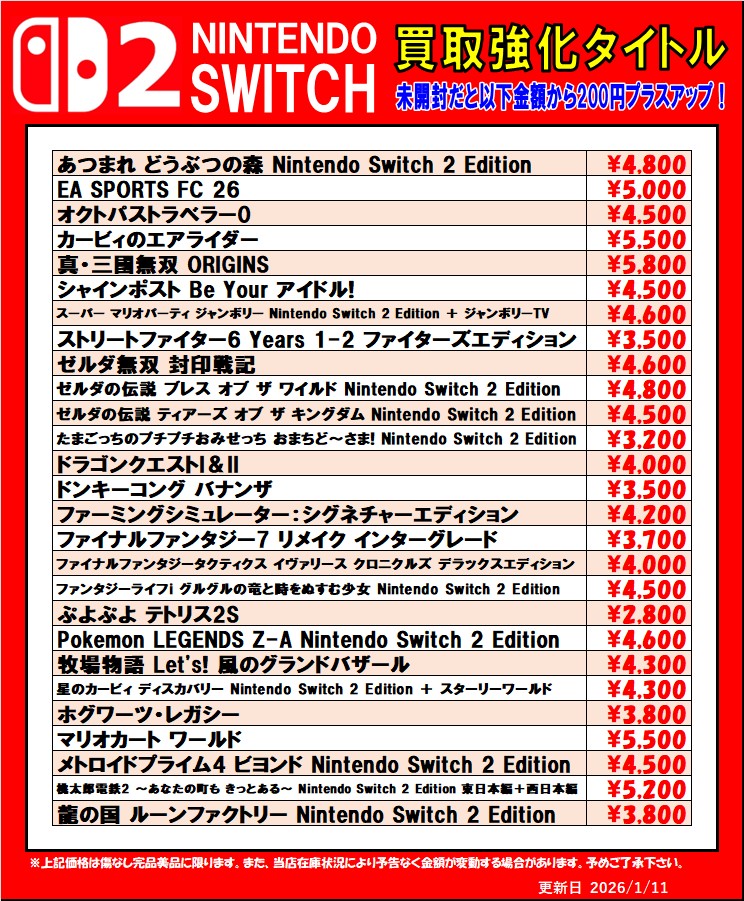 2026.01.12 買取情報 takalab_5 ■Switch2、Switch、PS5、PS4ソフト買取情報更新しました!◆#ゲーム #買取 #佐賀 #武雄 #PS4 #PS5 #Switch #Switch2 #あつ森 #FF7リメイク #コードヴェイン2■ Twitter Facebook はてブ LINE Pocket Switch2、Switch、PS5、PS4ソフト買取情報更新しました! ※2026/1/12現在の価格となります。 在庫状況などによってお値段が変動いたします。予めご了承ください。 **************** こちら↓もぜひチェックしてみてくださいね!(*´▽`*) ・最新のイベント情報はこちら ・最新の買取情報はこちら シェア! Twitter Facebook はてブ LINE Pocket feedly コメントを残す コメントをキャンセルメールアドレスが公開されることはありません。 ※ が付いている欄は必須項目ですコメント ※ 名前 ※ メール ※ サイト 新しいコメントをメールで通知 新しい投稿をメールで受け取る Δ このサイトはスパムを低減するために Akismet を使っています。コメントデータの処理方法の詳細はこちらをご覧ください。