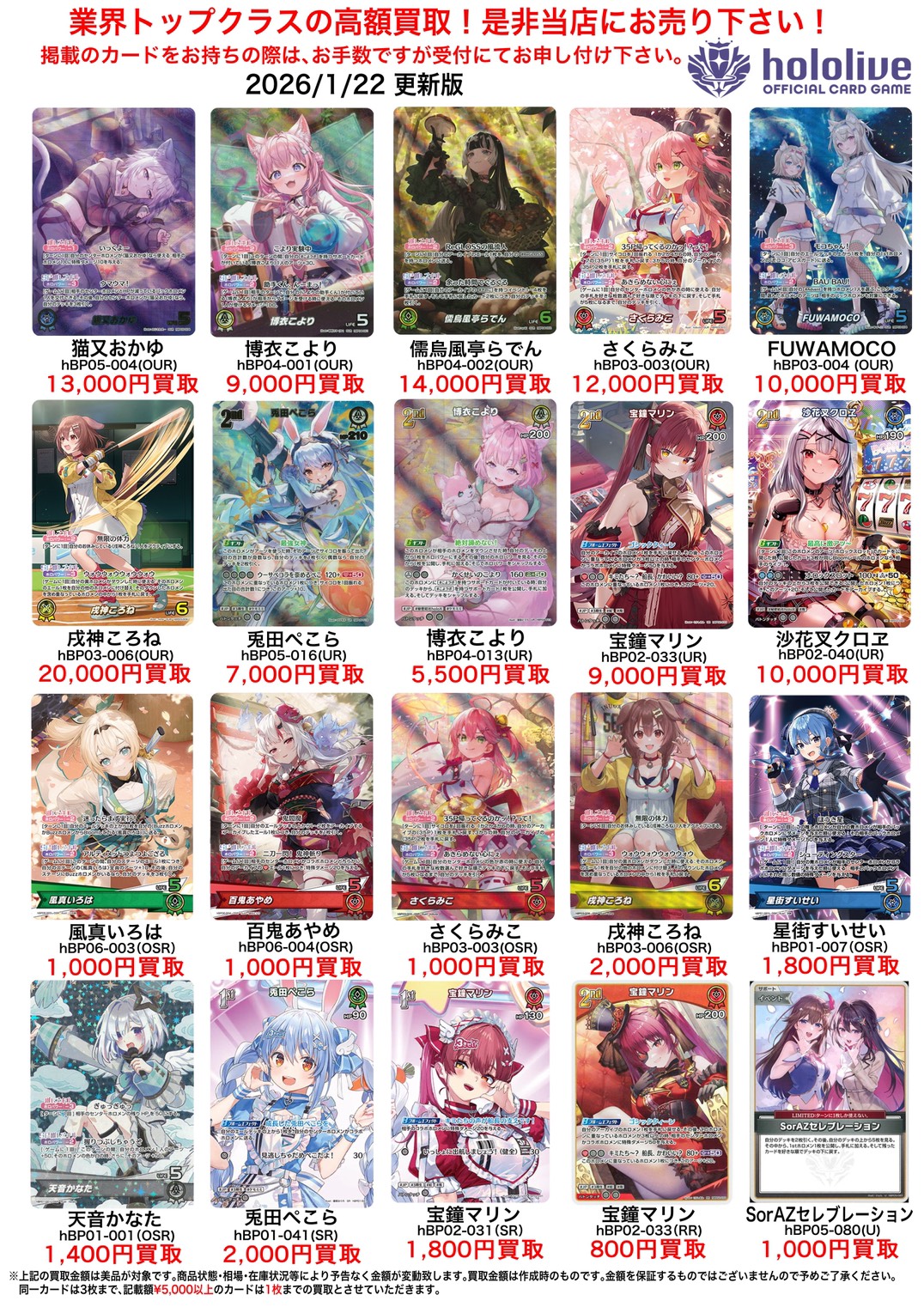 2026.01.22 買取情報 takalab_6 ホロライブ カード 買取情報です! Twitter Facebook はてブ LINE Pocket ★買取情報★ ※2026/1/22現在の価格となります。 在庫状況などによってお値段が変動いたします。予めご了承ください。 **************** こちら↓もぜひチェックしてみてくださいね!(*´▽`*) ・最新のイベント情報はこちら ・最新の買取情報はこちら シェア! Twitter Facebook はてブ LINE Pocket feedly コメントを残す コメントをキャンセルメールアドレスが公開されることはありません。 ※ が付いている欄は必須項目ですコメント ※ 名前 ※ メール ※ サイト 新しいコメントをメールで通知 新しい投稿をメールで受け取る Δ このサイトはスパムを低減するために Akismet を使っています。コメントデータの処理方法の詳細はこちらをご覧ください。