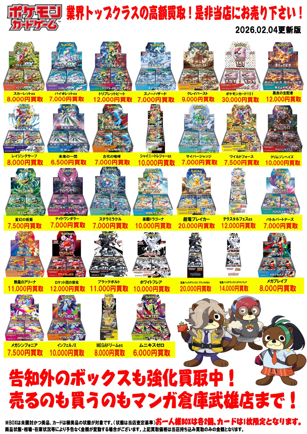 2026.02.04 買取情報 takalab_5 ★ポケモンカード買取価格更新しました!★ #TCG #ポケモンカードゲーム #佐賀 #武雄 #マンガ倉庫 Twitter Facebook はてブ LINE Pocket ※2026/2/4 現在の価格となります。 在庫状況・状態によってお値段が変動いたします。予めご了承ください。 シェア! Twitter Facebook はてブ LINE Pocket feedly
