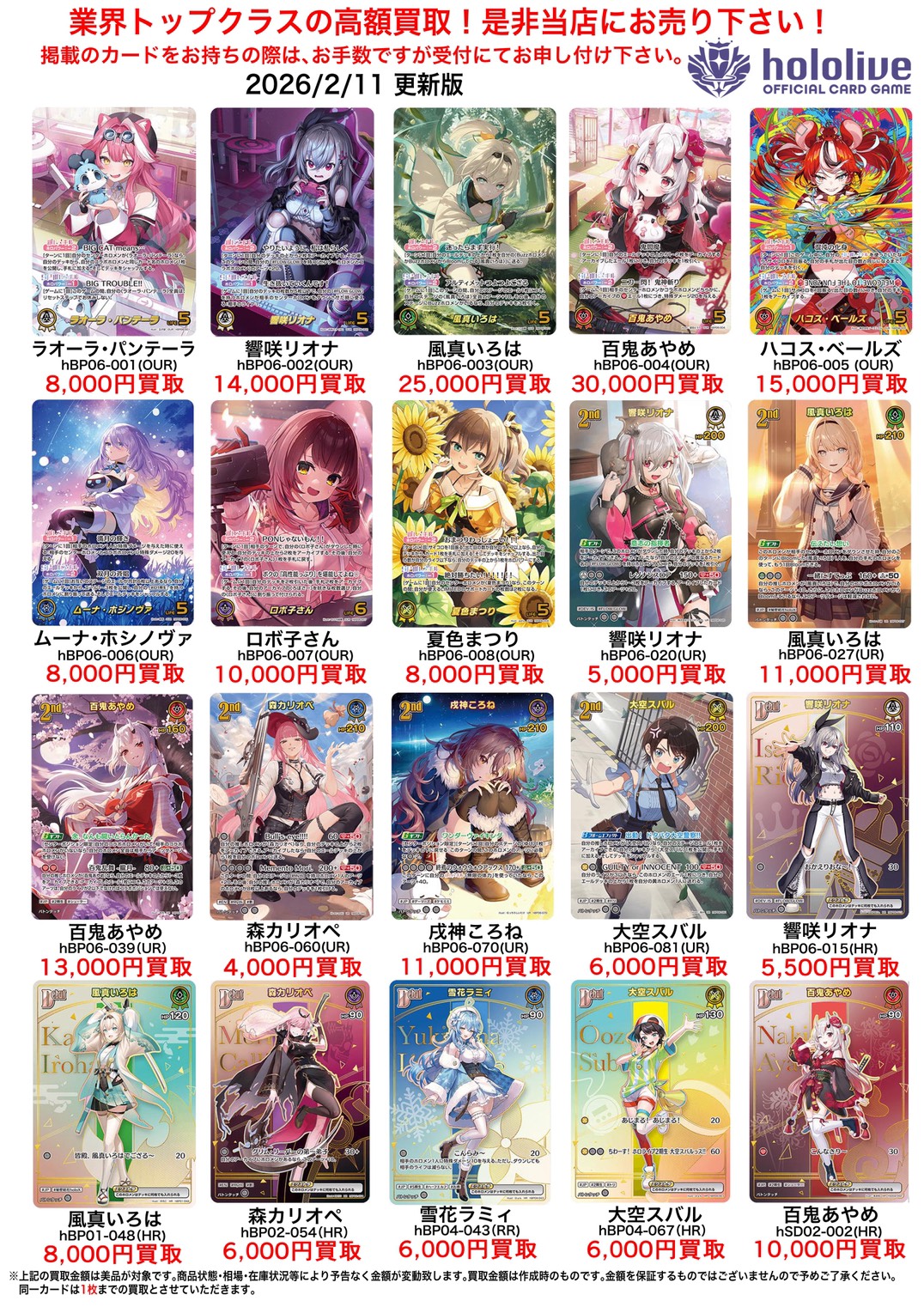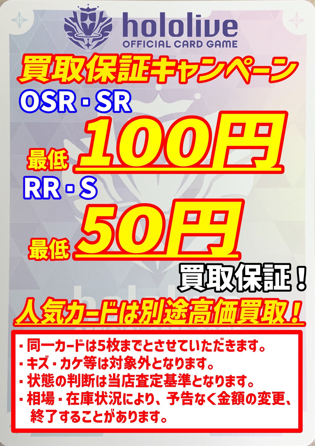 2026.02.11 買取情報 takalab_2 ★ホロライブカードゲーム買取告知★ Twitter Facebook はてブ LINE Pocket ★買取情報★ ※2026/2/11現在の価格となります。 在庫状況などによってお値段が変動いたします。予めご了承ください。 **************** こちら↓もぜひチェックしてみてくださいね!(*´▽`*) ・最新のイベント情報はこちら ・最新の買取情報はこちら シェア! Twitter Facebook はてブ LINE Pocket feedly コメントを残す コメントをキャンセルメールアドレスが公開されることはありません。 ※ が付いている欄は必須項目ですコメント ※ 名前 ※ メール ※ サイト 新しいコメントをメールで通知 新しい投稿をメールで受け取る Δ このサイトはスパムを低減するために Akismet を使っています。コメントデータの処理方法の詳細はこちらをご覧ください。