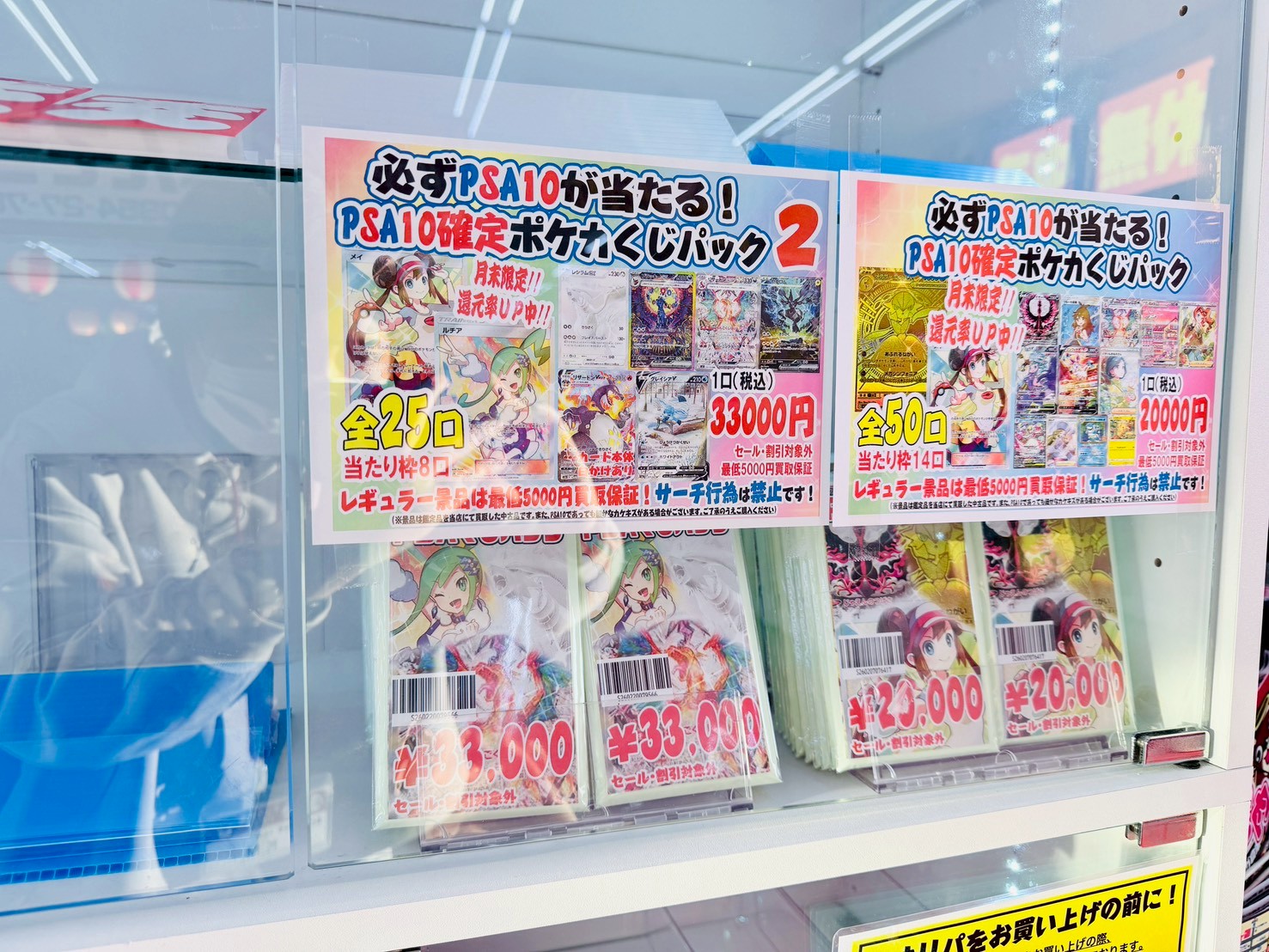 2026.02.21 カード takalab_2 ★ポケカ PSA10確定くじパック第2弾販売開始★#TCG #ポケモンカードゲーム #佐賀 #武雄 #マンガ倉庫■ Twitter Facebook はてブ LINE Pocket ポケカくじパック「PSA10確定くじパック」第2弾が販売開始です! 今回は1口33,000円、全25口! ポップに記載の当たり枠豪華景品は8口!月末につきいつもより還元率マシマシでご用意しております!!レギュラー景品は最低でも5000円で買取保証! 現品限り・早い者勝ち・売り切れ御免!!ぜひぜひお早めにお買い求めください✨ レジ前ショーケースにはこの他にもポケカお楽しみ袋などをご用意しております!ぜひ一度挑戦してみてください! シェア! Twitter Facebook はてブ LINE Pocket feedly
