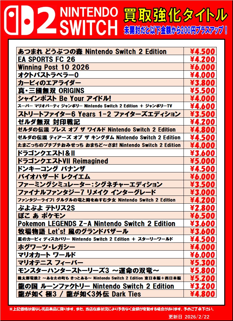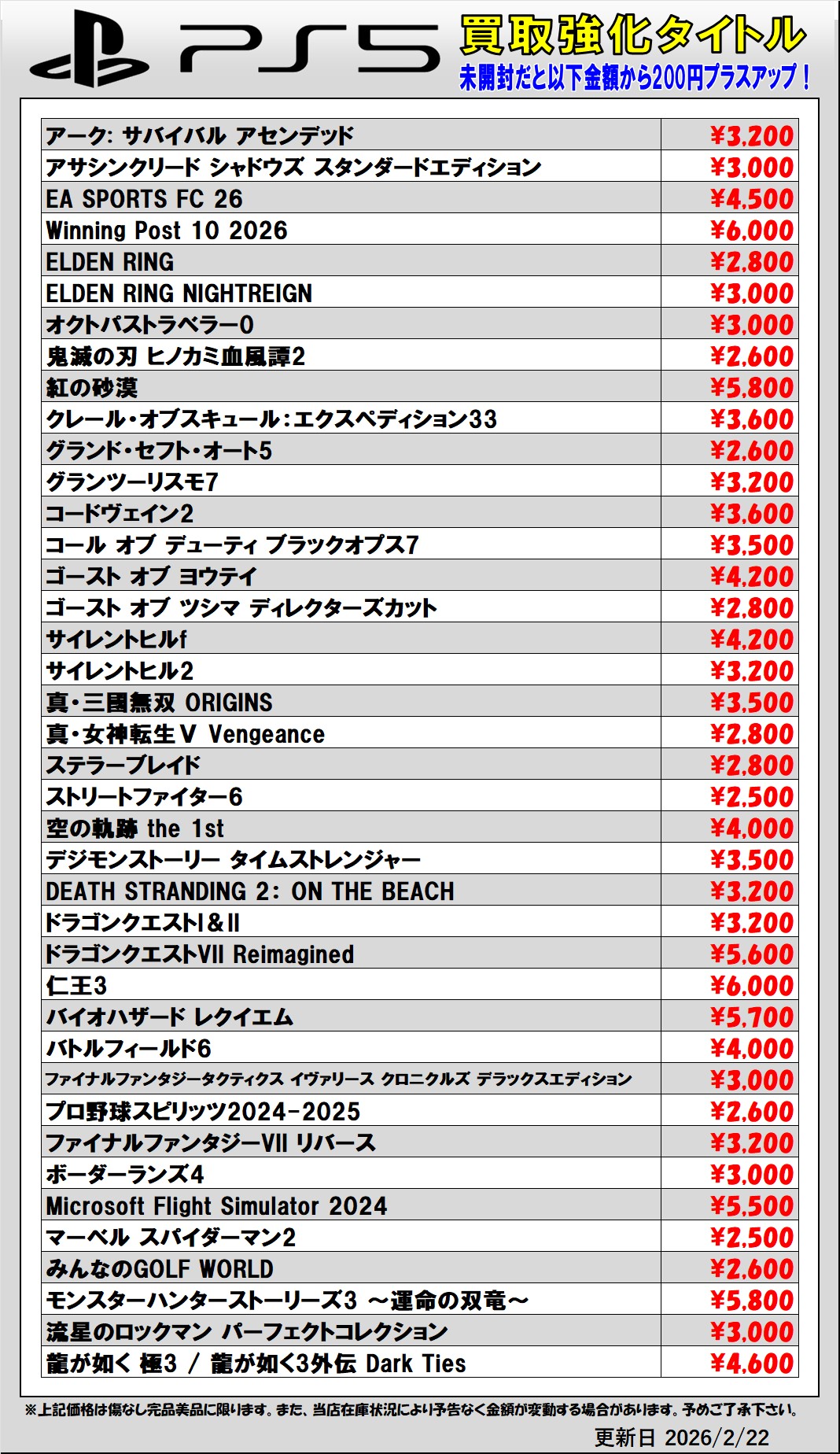 2026.02.22 買取情報 takalab_1 Switch2、Switch、PS5、PS4ソフト買取情報更新しました!#ゲーム #買取 #佐賀 #武雄 #PS4 #PS5 #Switch #Switch2 #バイオハザード レクイエム #ぽこ あ ポケモン Twitter Facebook はてブ LINE Pocket Switch2、Switch、PS5、PS4ソフト買取情報更新しました! ※2026/2/22現在の価格となります。 在庫状況などによってお値段が変動いたします。予めご了承ください。 **************** こちら↓もぜひチェックしてみてくださいね!(*´▽`*) ・最新のイベント情報はこちら ・最新の買取情報はこちら シェア! Twitter Facebook はてブ LINE Pocket feedly コメントを残す コメントをキャンセルメールアドレスが公開されることはありません。 ※ が付いている欄は必須項目ですコメント ※ 名前 ※ メール ※ サイト 新しいコメントをメールで通知 新しい投稿をメールで受け取る Δ このサイトはスパムを低減するために Akismet を使っています。コメントデータの処理方法の詳細はこちらをご覧ください。