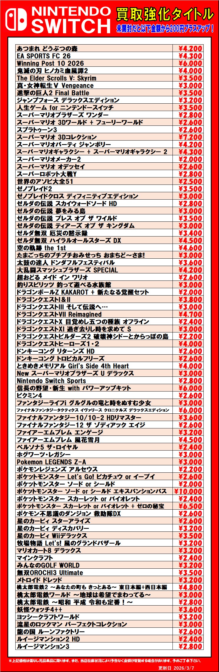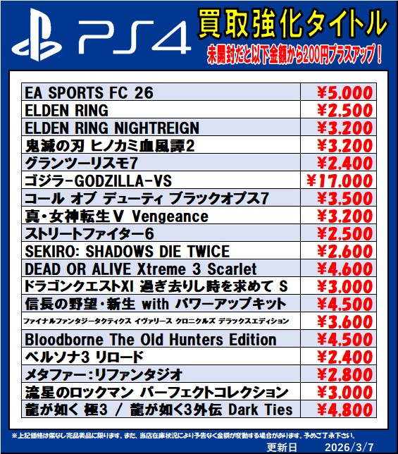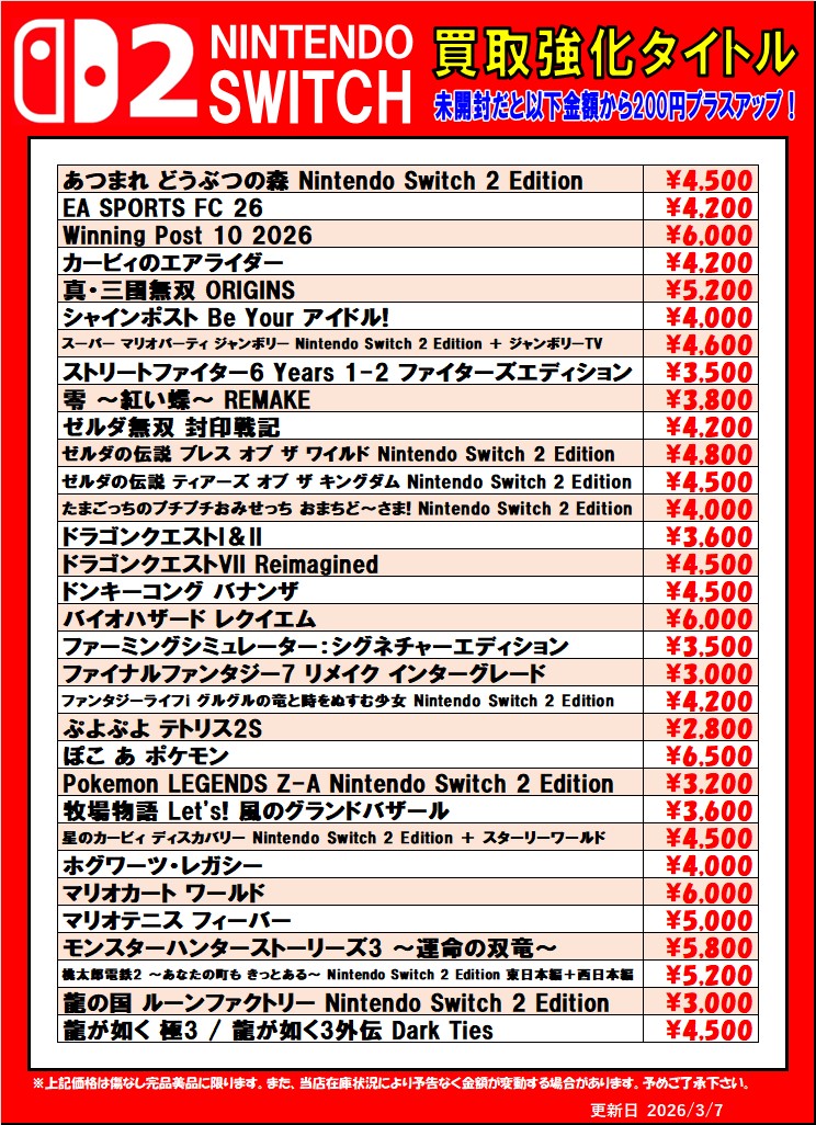 2026.03.07 買取情報 takalab_5 Switch2、Switch、PS5、PS4ソフト買取情報更新しました!#ゲーム #買取 #佐賀 #武雄 #PS4 #PS5 #Switch #Switch2 #バイオハザード レクイエム #ぽこ あ ポケモン Twitter Facebook はてブ LINE Pocket Switch2、Switch、PS5、PS4ソフト買取情報更新しました! ※2026/3/7現在の価格となります。 在庫状況などによってお値段が変動いたします。予めご了承ください。 **************** こちら↓もぜひチェックしてみてくださいね!(*´▽`*) ・最新のイベント情報はこちら ・最新の買取情報はこちら シェア! Twitter Facebook はてブ LINE Pocket feedly コメントを残す コメントをキャンセルメールアドレスが公開されることはありません。 ※ が付いている欄は必須項目ですコメント ※ 名前 ※ メール ※ サイト 新しいコメントをメールで通知 新しい投稿をメールで受け取る Δ このサイトはスパムを低減するために Akismet を使っています。コメントデータの処理方法の詳細はこちらをご覧ください。