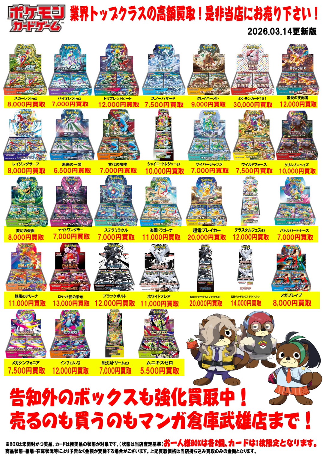 2026.03.14 買取情報 takalab_1 ポケモンカード買取告知更新しました! Twitter Facebook はてブ LINE Pocket ポケモンカード買取告知更新しました! ※2026/3/14現在の価格となります。 在庫状況などによってお値段が変動いたします。予めご了承ください。 **************** こちら↓もぜひチェックしてみてくださいね!(*´▽`*) ・最新のイベント情報はこちら ・最新の買取情報はこちら シェア! Twitter Facebook はてブ LINE Pocket feedly コメントを残す コメントをキャンセルメールアドレスが公開されることはありません。 ※ が付いている欄は必須項目ですコメント ※ 名前 ※ メール ※ サイト 新しいコメントをメールで通知 新しい投稿をメールで受け取る Δ このサイトはスパムを低減するために Akismet を使っています。コメントデータの処理方法の詳細はこちらをご覧ください。