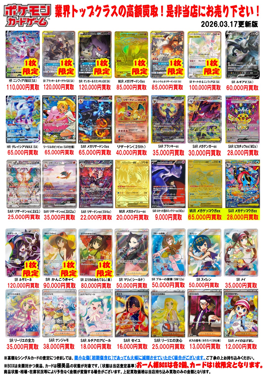 2026.03.17 買取情報 takalab_2 ★ポケモンカード買取告知★ Twitter Facebook はてブ LINE Pocket ★買取情報★ ※2026/3/17現在の価格となります。 在庫状況などによってお値段が変動いたします。予めご了承ください。 **************** こちら↓もぜひチェックしてみてくださいね!(*´▽`*) ・最新のイベント情報はこちら ・最新の買取情報はこちら シェア! Twitter Facebook はてブ LINE Pocket feedly コメントを残す コメントをキャンセルメールアドレスが公開されることはありません。 ※ が付いている欄は必須項目ですコメント ※ 名前 ※ メール ※ サイト 新しいコメントをメールで通知 新しい投稿をメールで受け取る Δ このサイトはスパムを低減するために Akismet を使っています。コメントデータの処理方法の詳細はこちらをご覧ください。