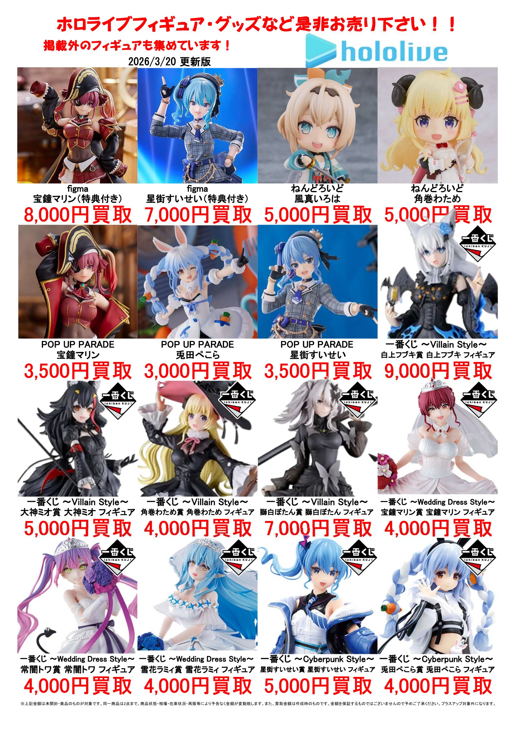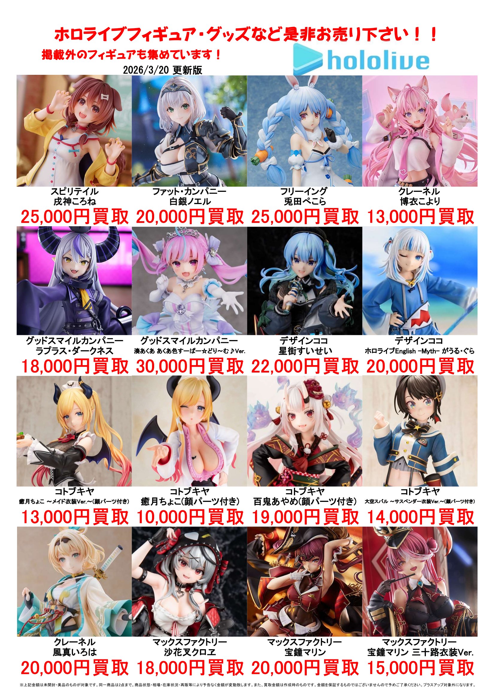 2026.03.20 買取情報 takalab_1 ホロライブフィギュア買取告知更新しました! Twitter Facebook はてブ LINE Pocket ホロライブフィギュア買取告知更新しました! ※2026/3/20現在の価格となります。 在庫状況などによってお値段が変動いたします。予めご了承ください。 **************** こちら↓もぜひチェックしてみてくださいね!(*´▽`*) ・最新のイベント情報はこちら ・最新の買取情報はこちら シェア! Twitter Facebook はてブ LINE Pocket feedly コメントを残す コメントをキャンセルメールアドレスが公開されることはありません。 ※ が付いている欄は必須項目ですコメント ※ 名前 ※ メール ※ サイト 新しいコメントをメールで通知 新しい投稿をメールで受け取る Δ このサイトはスパムを低減するために Akismet を使っています。コメントデータの処理方法の詳細はこちらをご覧ください。
