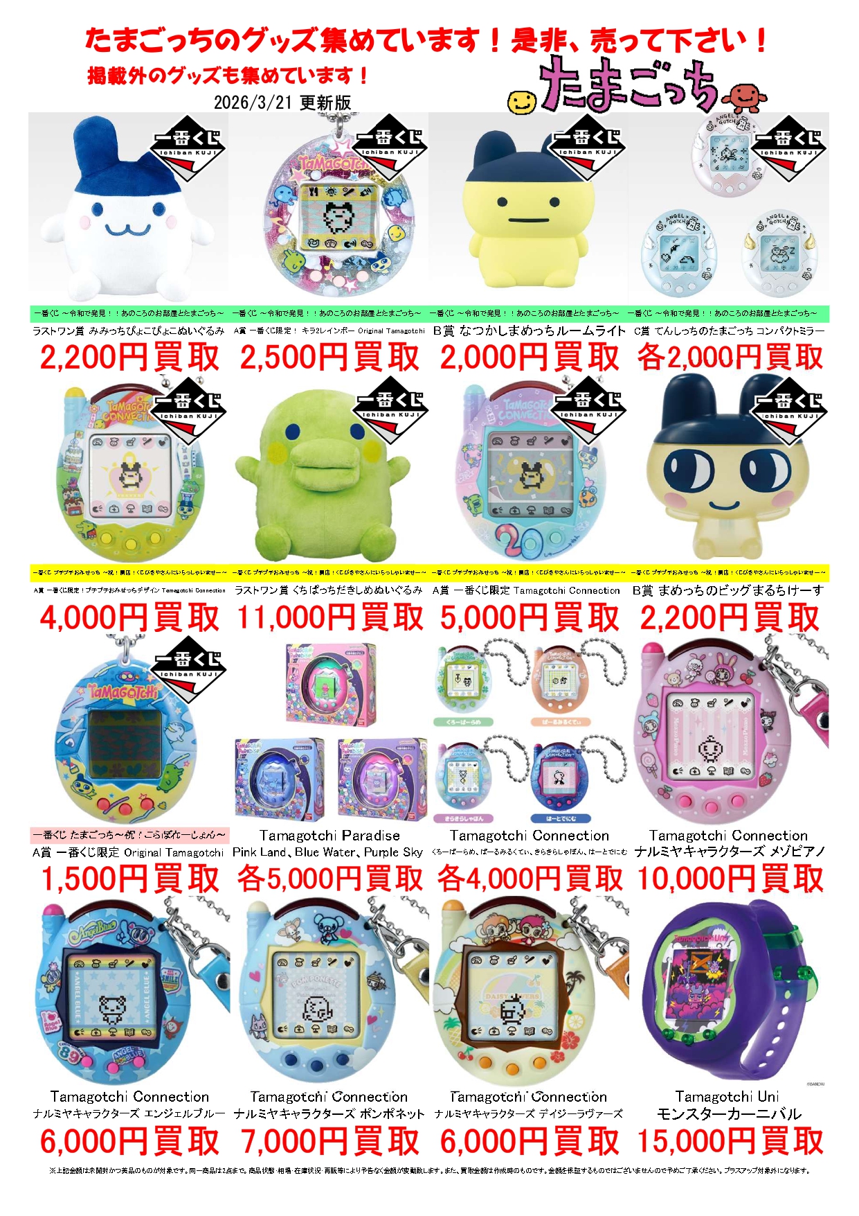 2026.03.21 買取情報 takalab_1 たまごっち買取告知更新しました! Twitter Facebook はてブ LINE Pocket たまごっち買取告知更新しました! ※2026/3/21現在の価格となります。 在庫状況などによってお値段が変動いたします。予めご了承ください。 **************** こちら↓もぜひチェックしてみてくださいね!(*´▽`*) ・最新のイベント情報はこちら ・最新の買取情報はこちら シェア! Twitter Facebook はてブ LINE Pocket feedly コメントを残す コメントをキャンセルメールアドレスが公開されることはありません。 ※ が付いている欄は必須項目ですコメント ※ 名前 ※ メール ※ サイト 新しいコメントをメールで通知 新しい投稿をメールで受け取る Δ このサイトはスパムを低減するために Akismet を使っています。コメントデータの処理方法の詳細はこちらをご覧ください。