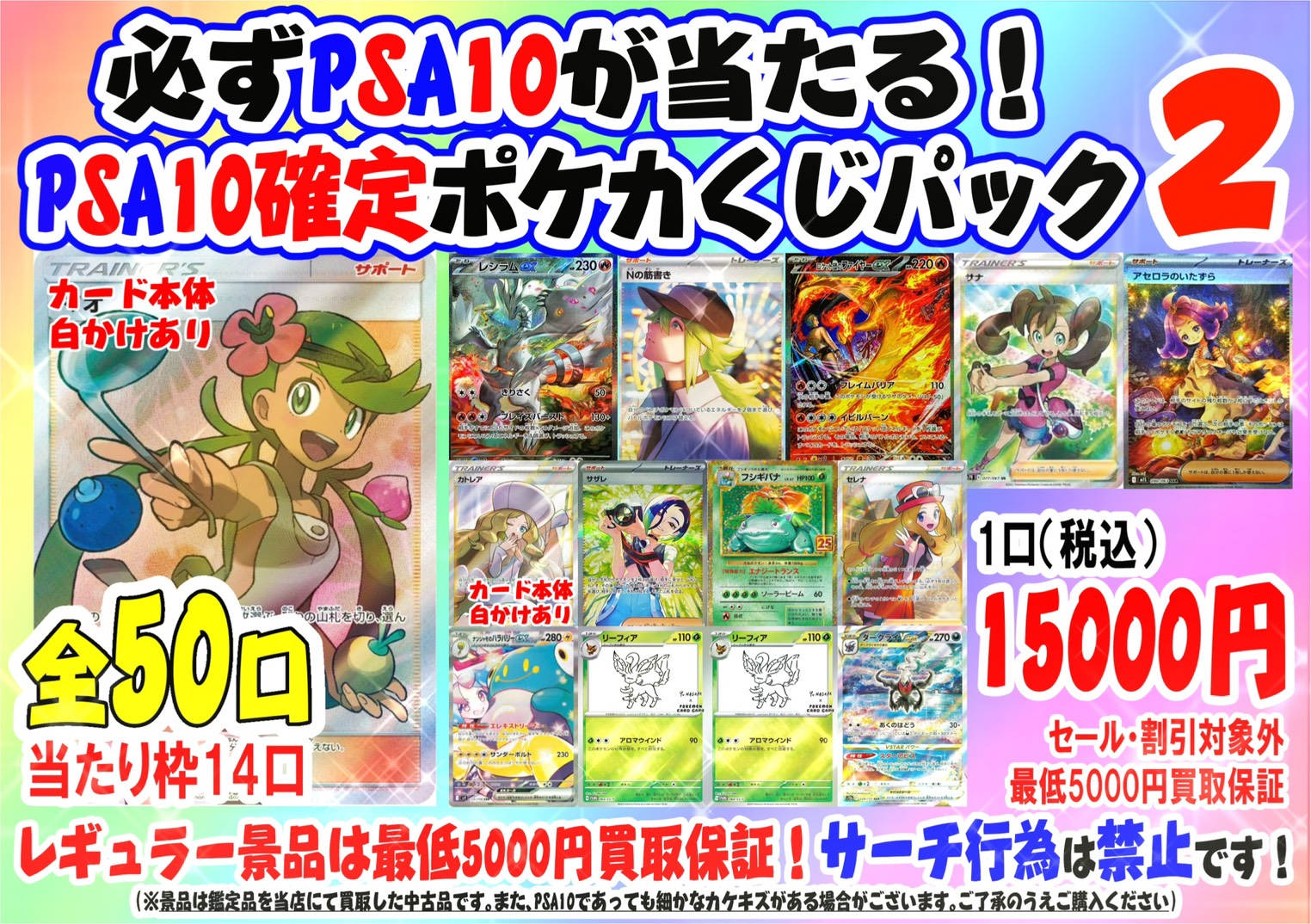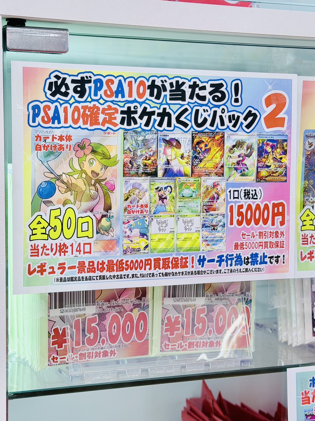 2026.04.01 カード takalab_2 ★ポケカ PSA10確定ゲットチャレンジ販売開始★#TCG #ポケモンカードゲーム #佐賀 #武雄 #マンガ倉庫■ Twitter Facebook はてブ LINE Pocket ★ポケカ PSA10確定ゲットチャレンジ販売開始★ 「ポケカ PSAゲットチャレンジ 2」を発売いたしました! 1口15,000円、全50口!景品は全てPSA10確定です✨今回の目玉はマオSR!👀 現品限り・早い者勝ち・売り切れ御免!!ぜひぜひお早めにお買い求めください✨ レジ前ショーケースにはこの他にもポケカお楽しみ袋などをご用意しております! ぜひ一度挑戦してみてください! シェア! Twitter Facebook はてブ LINE Pocket feedly