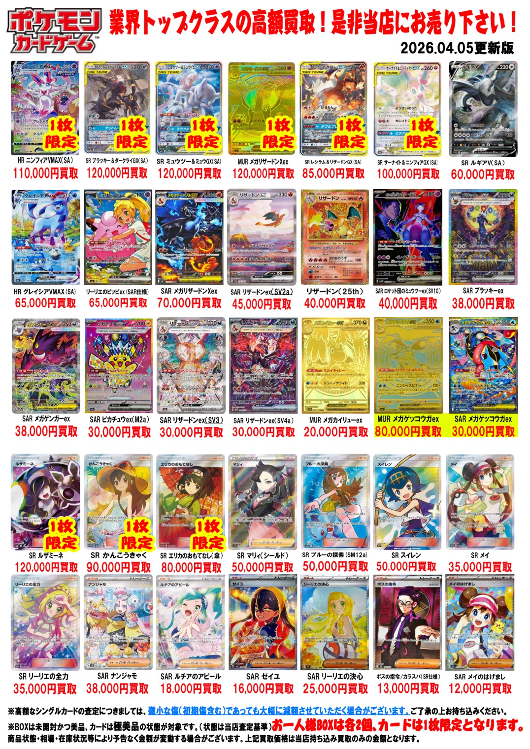 2026.04.05 買取情報 takalab_1 ポケモンカード買取告知更新しました! Twitter Facebook はてブ LINE Pocket ポケモンカード買取告知更新しました! ※2026/4/5現在の価格となります。 在庫状況などによってお値段が変動いたします。予めご了承ください。 **************** こちら↓もぜひチェックしてみてくださいね!(*´▽`*) ・最新のイベント情報はこちら ・最新の買取情報はこちら シェア! Twitter Facebook はてブ LINE Pocket feedly コメントを残す コメントをキャンセルメールアドレスが公開されることはありません。 ※ が付いている欄は必須項目ですコメント ※ 名前 ※ メール ※ サイト 新しいコメントをメールで通知 新しい投稿をメールで受け取る Δ このサイトはスパムを低減するために Akismet を使っています。コメントデータの処理方法の詳細はこちらをご覧ください。