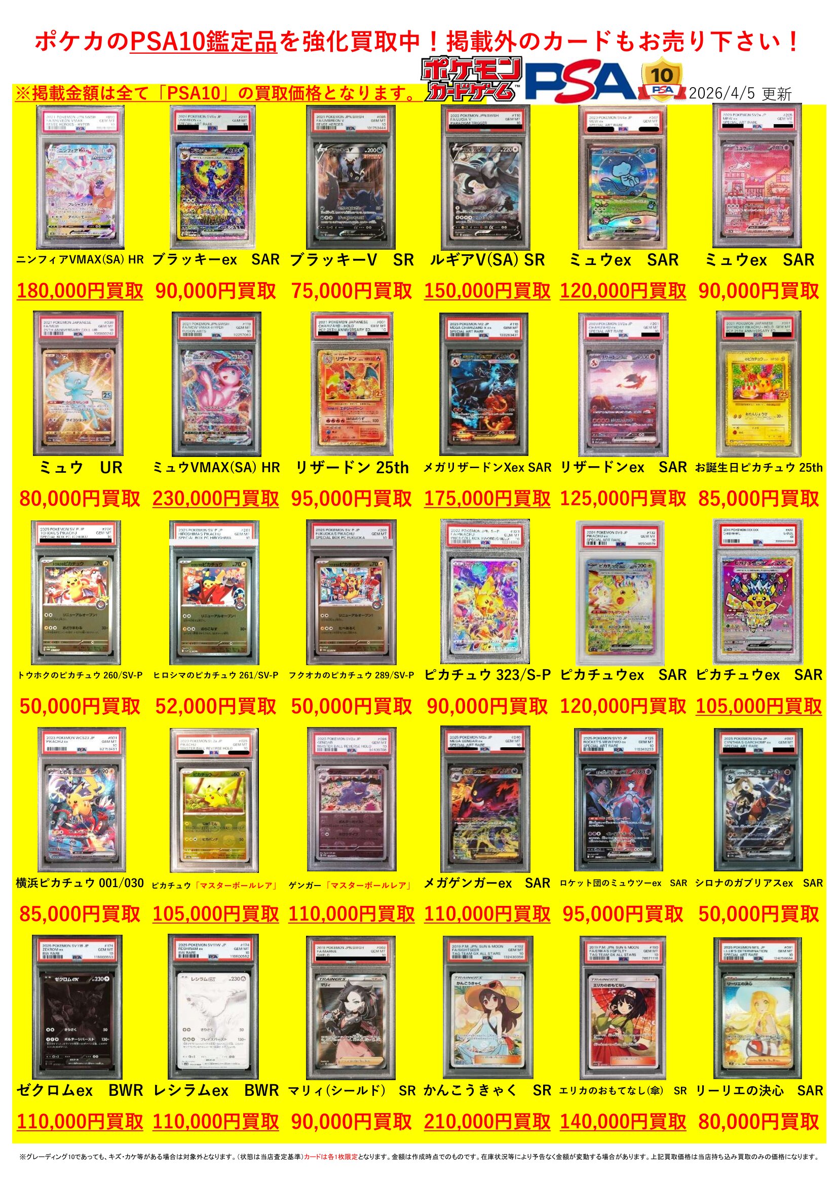 2026.04.06 買取情報 takalab_4 ★ポケカ PSA10買取価格更新しました!★ #TCG #ポケモンカードゲーム #佐賀 #武雄 #マンガ倉庫 Twitter Facebook はてブ LINE Pocket ★ポケカ PSA10買取価格更新しました!★ ※2026/4/5現在の価格となります。 在庫状況などによってお値段が変動いたします。予めご了承ください。 **************** こちら↓もぜひチェックしてみてくださいね!(*´▽`*) ・最新のイベント情報はこちら ・最新の買取情報はこちら シェア! Twitter Facebook はてブ LINE Pocket feedly