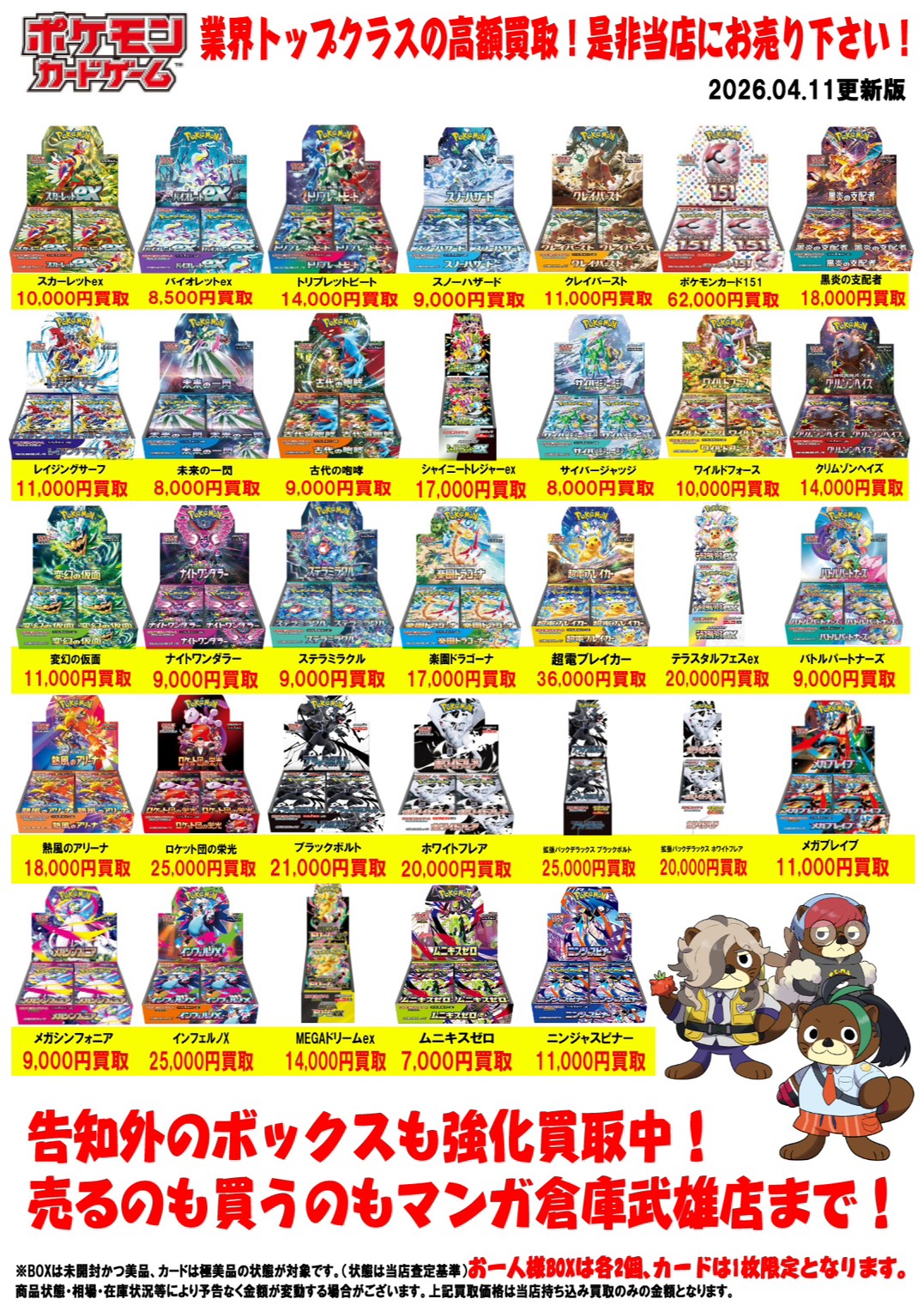 2026.04.11 買取情報 takalab_1 ワンピースカード・ポケモンカード買取告知更新しました! Twitter Facebook はてブ LINE Pocket ワンピースカード・ポケモンカード買取告知更新しました! ※2026/4/11現在の価格となります。 在庫状況などによってお値段が変動いたします。予めご了承ください。 **************** こちら↓もぜひチェックしてみてくださいね!(*´▽`*) ・最新のイベント情報はこちら ・最新の買取情報はこちら シェア! Twitter Facebook はてブ LINE Pocket feedly コメントを残す コメントをキャンセルメールアドレスが公開されることはありません。 ※ が付いている欄は必須項目ですコメント ※ 名前 ※ メール ※ サイト 新しいコメントをメールで通知 新しい投稿をメールで受け取る Δ このサイトはスパムを低減するために Akismet を使っています。コメントデータの処理方法の詳細はこちらをご覧ください。