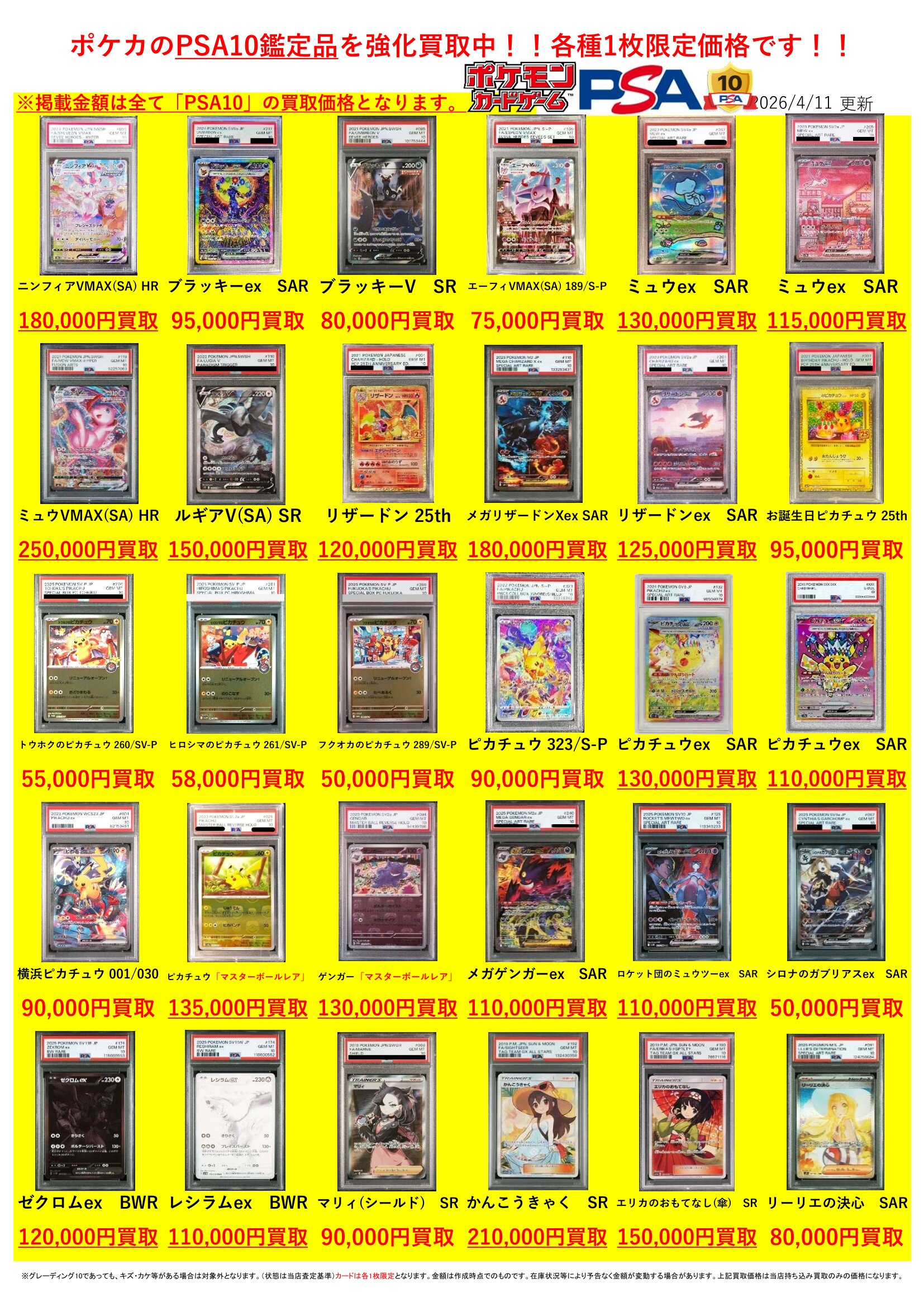 2026.04.11 買取情報 takalab_2 ★ポケモンカードPSA10買取告知★ Twitter Facebook はてブ LINE Pocket ★買取情報★ ※2026/4/11現在の価格となります。 在庫状況などによってお値段が変動いたします。予めご了承ください。 **************** こちら↓もぜひチェックしてみてくださいね!(*´▽`*) ・最新のイベント情報はこちら ・最新の買取情報はこちら シェア! Twitter Facebook はてブ LINE Pocket feedly コメントを残す コメントをキャンセルメールアドレスが公開されることはありません。 ※ が付いている欄は必須項目ですコメント ※ 名前 ※ メール ※ サイト 新しいコメントをメールで通知 新しい投稿をメールで受け取る Δ このサイトはスパムを低減するために Akismet を使っています。コメントデータの処理方法の詳細はこちらをご覧ください。