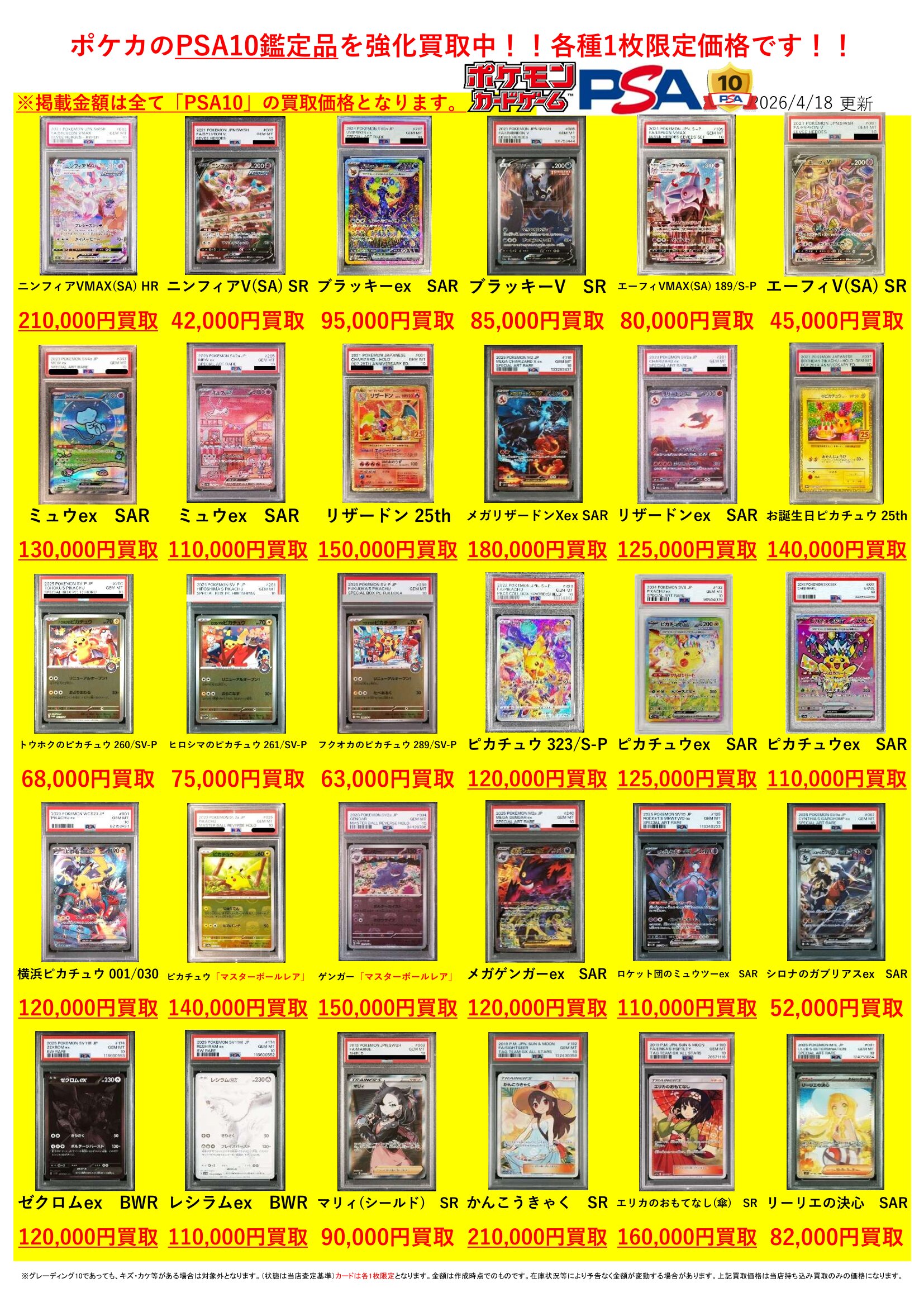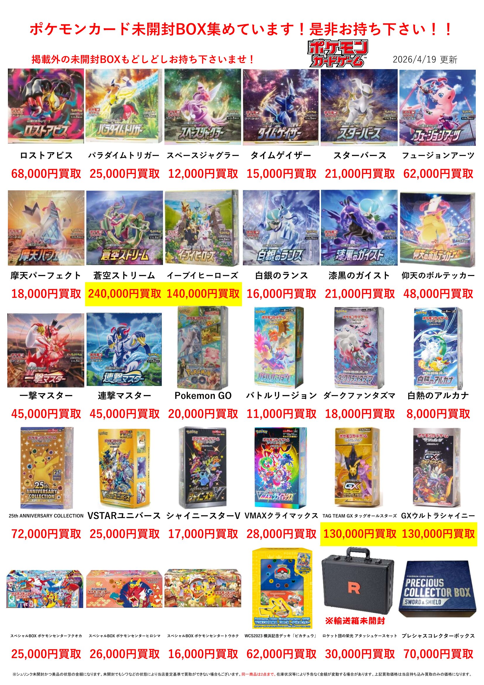 2026.04.19 買取情報 takalab_2 ★ポケモンカードPSA10&未開封BOX買取告知★ Twitter Facebook はてブ LINE Pocket ★買取情報★ ※2026/4/19現在の価格となります。 在庫状況などによってお値段が変動いたします。予めご了承ください。 **************** こちら↓もぜひチェックしてみてくださいね!(*´▽`*) ・最新のイベント情報はこちら ・最新の買取情報はこちら シェア! Twitter Facebook はてブ LINE Pocket feedly コメントを残す コメントをキャンセルメールアドレスが公開されることはありません。 ※ が付いている欄は必須項目ですコメント ※ 名前 ※ メール ※ サイト 新しいコメントをメールで通知 新しい投稿をメールで受け取る Δ このサイトはスパムを低減するために Akismet を使っています。コメントデータの処理方法の詳細はこちらをご覧ください。