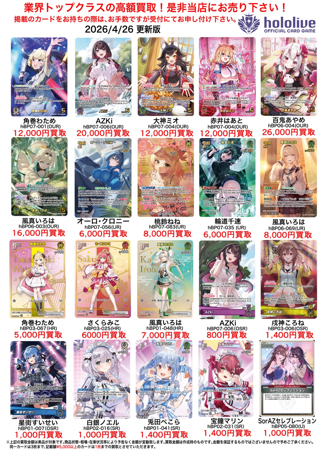 2026.04.26 買取情報 takalab_2 ★ホロライブオフィシャルカードゲーム買取告知★ Twitter Facebook はてブ LINE Pocket ★買取情報★ ※2026/4/26現在の価格となります。 在庫状況などによってお値段が変動いたします。予めご了承ください。 **************** こちら↓もぜひチェックしてみてくださいね!(*´▽`*) ・最新のイベント情報はこちら ・最新の買取情報はこちら シェア! Twitter Facebook はてブ LINE Pocket feedly コメントを残す コメントをキャンセルメールアドレスが公開されることはありません。 ※ が付いている欄は必須項目ですコメント ※ 名前 ※ メール ※ サイト 新しいコメントをメールで通知 新しい投稿をメールで受け取る Δ このサイトはスパムを低減するために Akismet を使っています。コメントデータの処理方法の詳細はこちらをご覧ください。