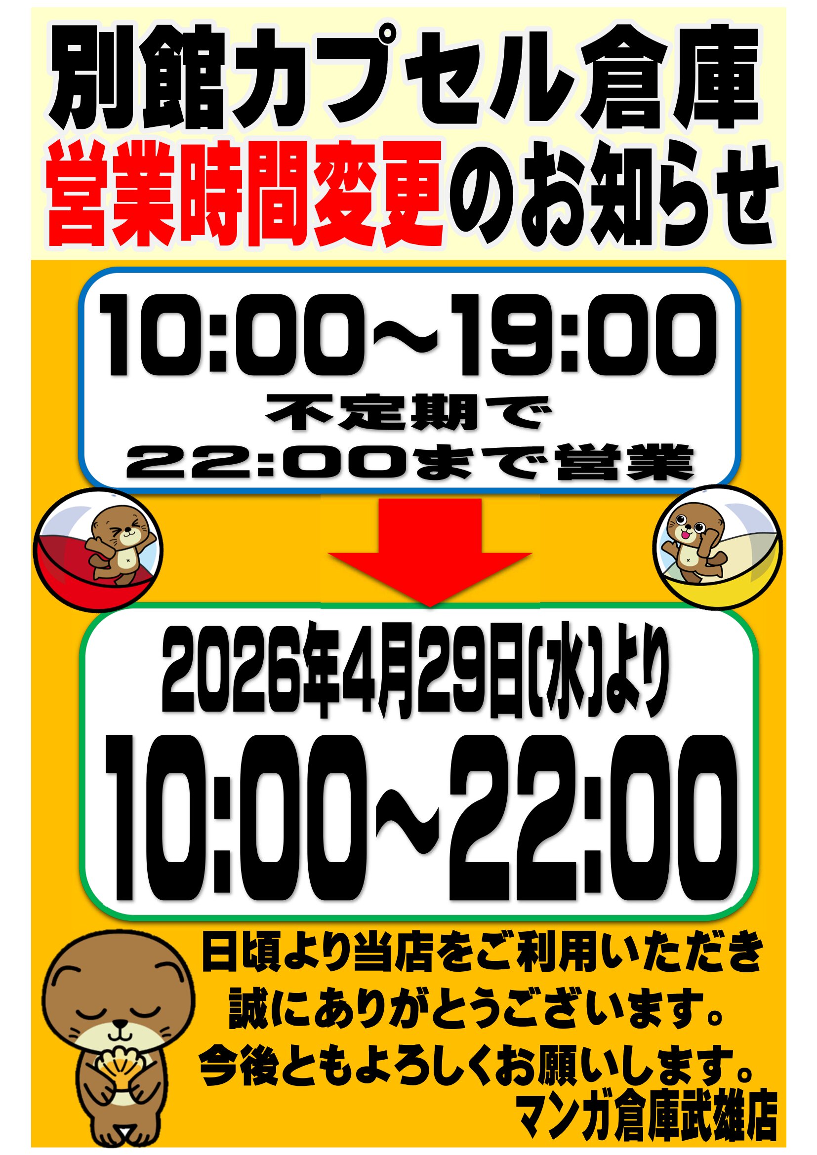 2026.04.29 お知らせ takalab_2 ★《4月29日より》別館カプセル倉庫の営業時間のお知らせ★#武雄カプセルガチャ #カプセル倉庫 #マンガ倉庫 #ガチャガチャ■ Twitter Facebook はてブ LINE Pocket ★別館カプセル倉庫の営業時間のお知らせ★ 日頃より当店をご利用いただき、誠にありがとうございます。 別館・カプセル倉庫の営業時間についてお知らせいたします。 このたび、営業時間を変更することとなりました。 本日4月29日より22時まで営業いたします。 皆さまのご来店をお待ちしております。 シェア! Twitter Facebook はてブ LINE Pocket feedly