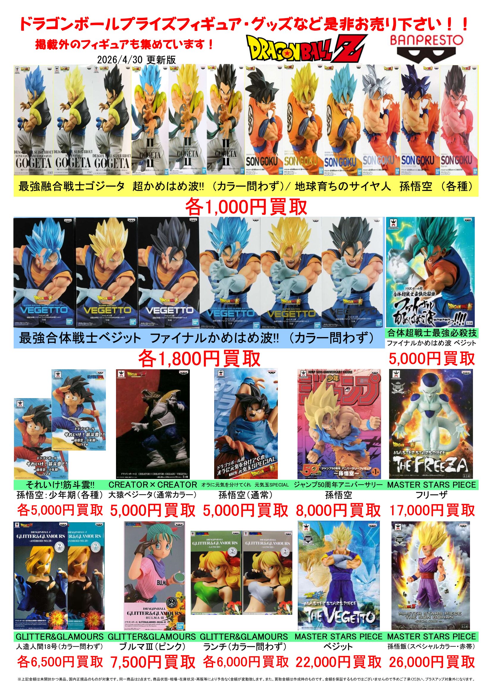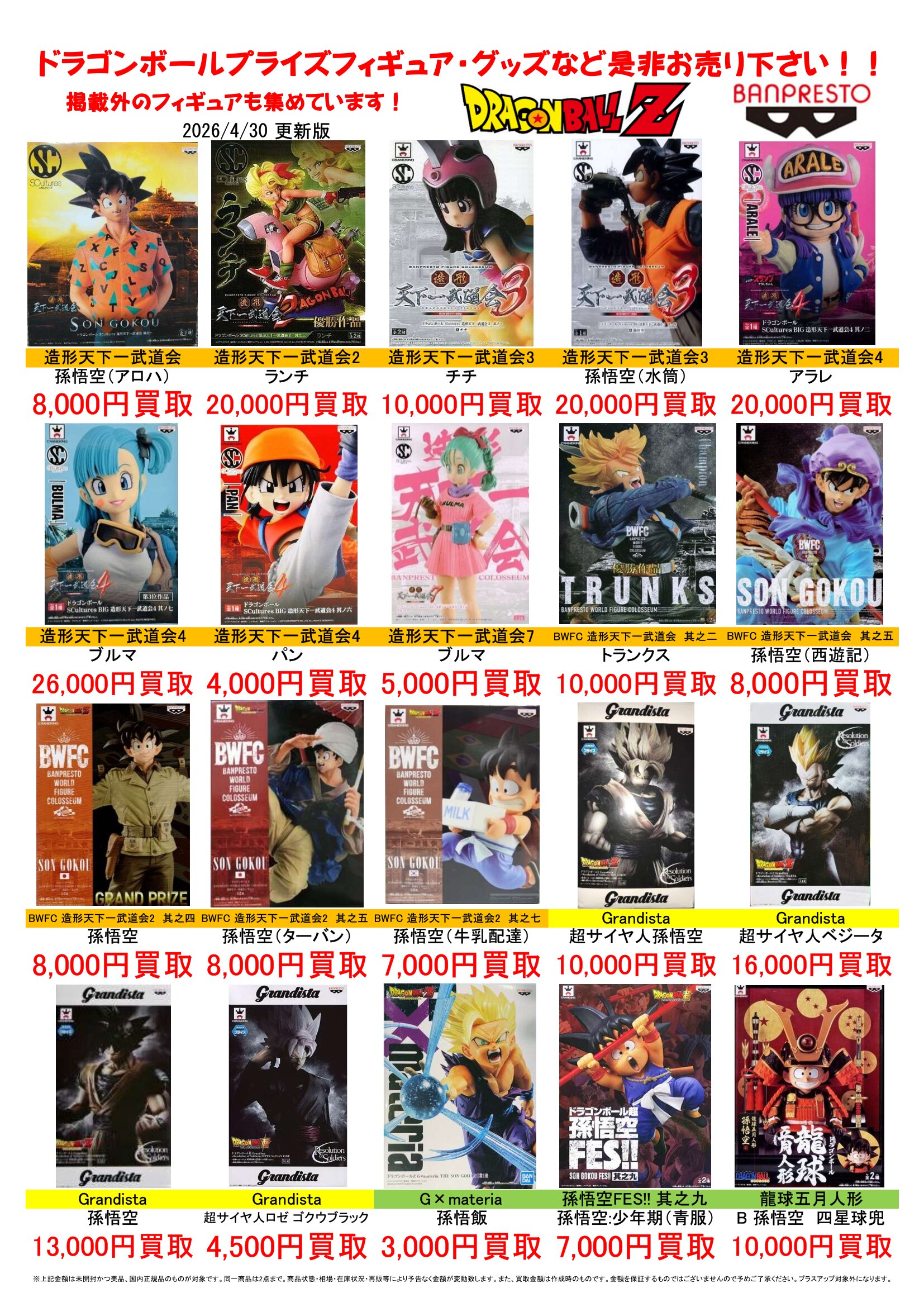 2026.04.29 買取情報 takalab_1 ドラゴンボールプライズフィギュア買取告知更新しました! Twitter Facebook はてブ LINE Pocket ドラゴンボールプライズフィギュア買取告知更新しました! ※2026/4/29現在の価格となります。 在庫状況などによってお値段が変動いたします。予めご了承ください。 **************** こちら↓もぜひチェックしてみてくださいね!(*´▽`*) ・最新のイベント情報はこちら ・最新の買取情報はこちら シェア! Twitter Facebook はてブ LINE Pocket feedly コメントを残す コメントをキャンセルメールアドレスが公開されることはありません。 ※ が付いている欄は必須項目ですコメント ※ 名前 ※ メール ※ サイト 新しいコメントをメールで通知 新しい投稿をメールで受け取る Δ このサイトはスパムを低減するために Akismet を使っています。コメントデータの処理方法の詳細はこちらをご覧ください。