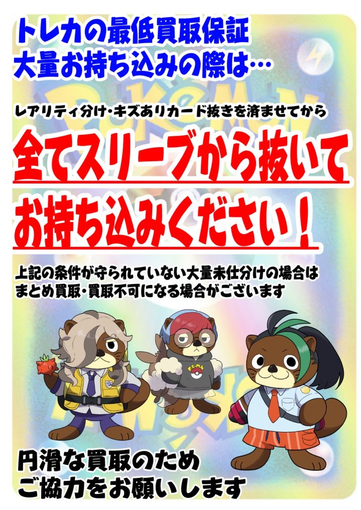 最低買取保証のトレカを大量にお持ち込みいただく際は、 レアリティ分けや傷があるカードの仕分けを済ませていただき、 【全てスリーブから抜いた状態で】お持ち込みをお願いいたします! 上記がなされていない未仕分けカードの大量持…