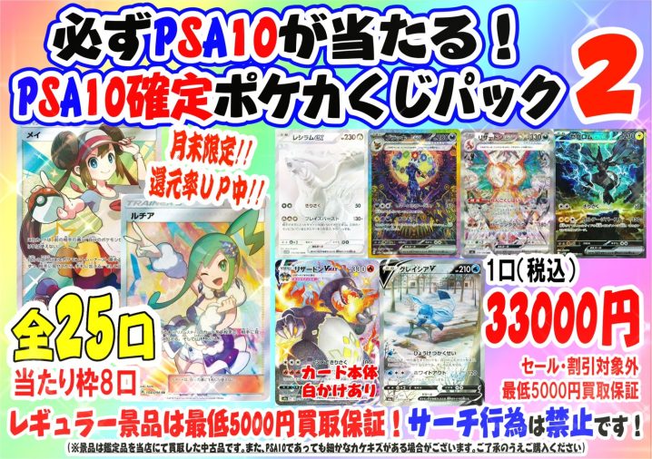 ポケカくじパック「PSA10確定くじパック」第2弾が販売開始です! 今回は1口33,000円、全25口! ポップに記載の当たり枠豪華景品は8口!月末につきいつもより還元率マシマシでご用意しております!!レギュラー景品は最…