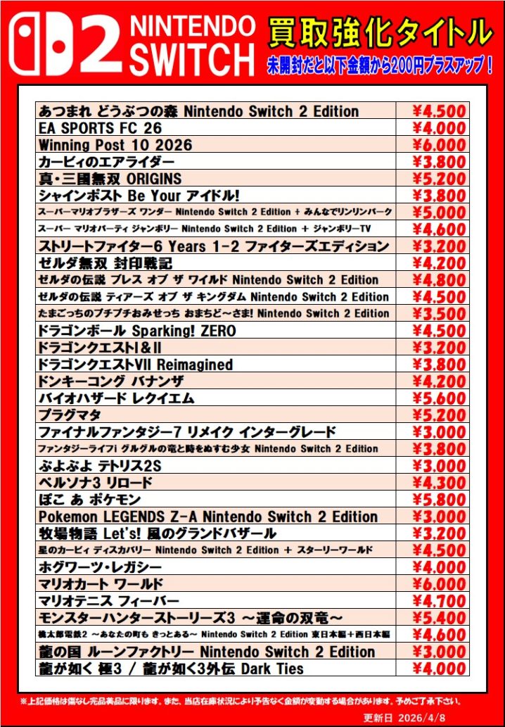 Switch2、Switch、PS5、PS4ソフト買取情報更新しました! ※2026/3/7現在の価格となります。 在庫状況などによってお値段が変動いたします。予めご了承ください。 **************** こち…