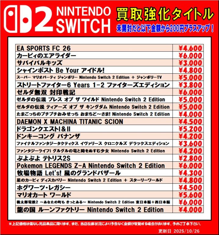 Switch2、Switch、PS5、PS4ソフト買取情報更新しました! ※2025/10/26現在の価格となります。 在庫状況などによってお値段が変動いたします。予めご了承ください。 **************** …