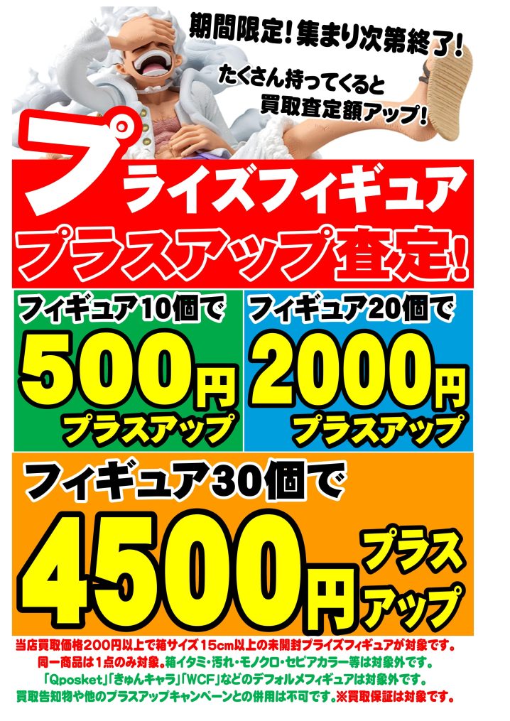 期間限定! プライズフィギュアのプラスアップを開始しました! 対象のフィギュアをたくさんお持ちいただくと、通常査定よりプラスアップ査定! 10個→500円アップ! 20個→2,000円アップ! 30個→4,500円アップ…