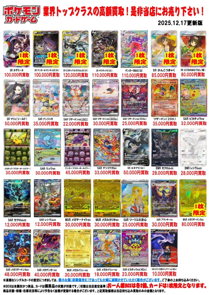 ポケモンカード買取告知更新しました! ※2025/12/13現在の価格となります。 在庫状況などによってお値段が変動いたします。予めご了承ください。 **************** こちら↓もぜひチェックしてみてくださ…