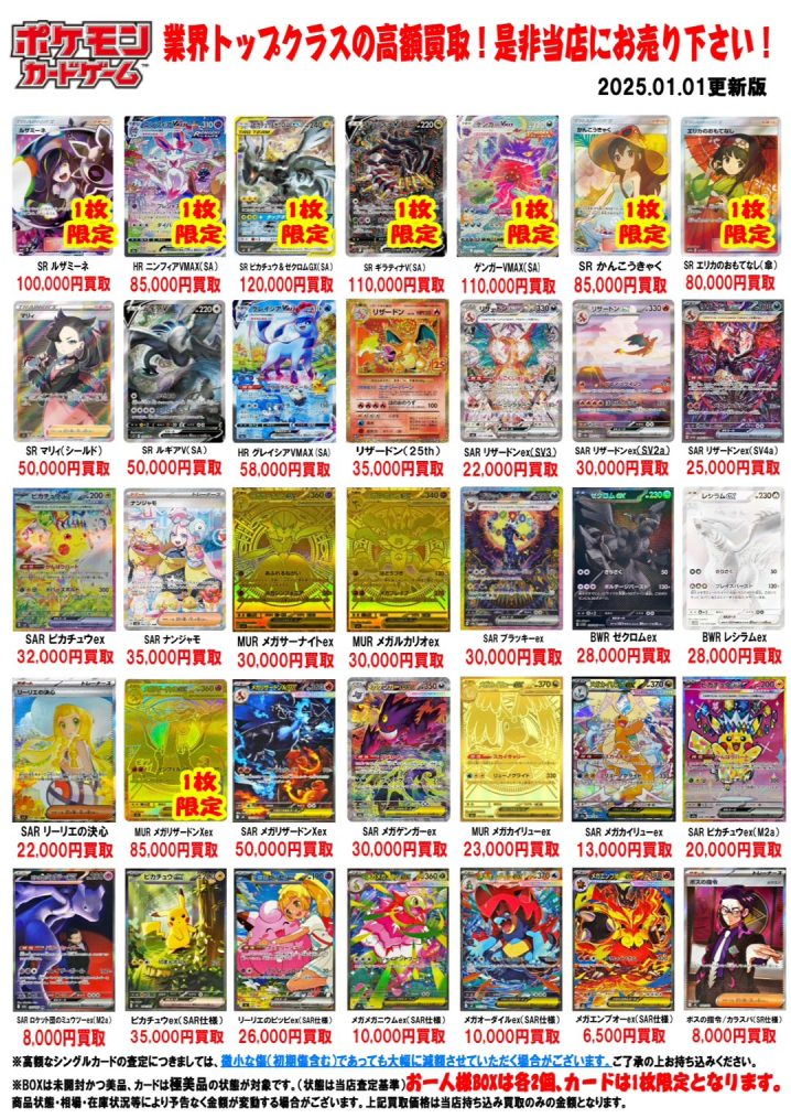 ポケモンカード買取告知更新しました! ※2026/1/1現在の価格となります。 在庫状況などによってお値段が変動いたします。予めご了承ください。 **************** こちら↓もぜひチェックしてみてくださいね…