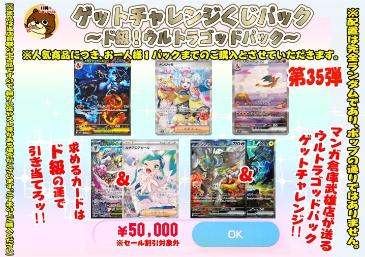 明日(11/2)朝10時より、ゲットチャレンジくじパック~ウルトラゴッドパック~第35弾を発売いたします!5パック限定のゴッドパックを掴み取れ! ※人気商品により、おひとり様1パックまでの販売とさせていただきますのでご了…