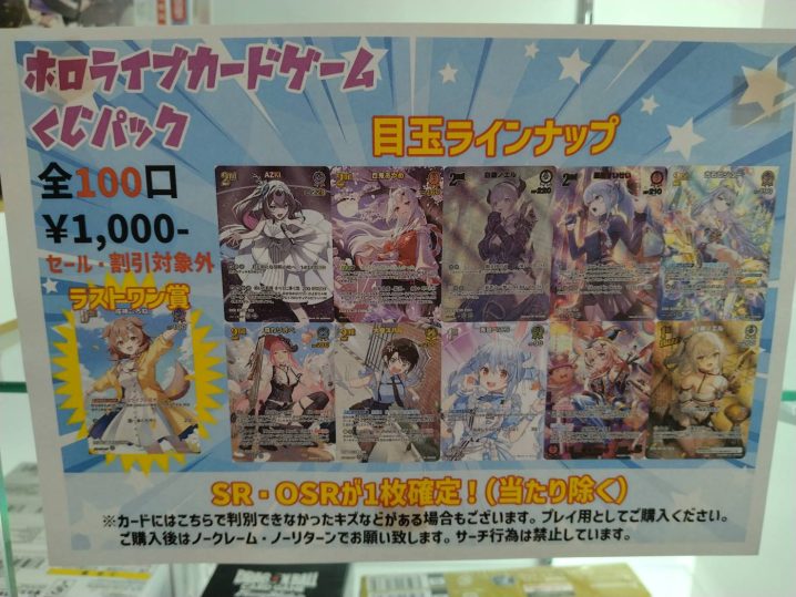 ホロライブOCGの1000円くじパックの販売を開始致しました! 全100口、SRもしくはOSRが1枚確定!(当たり除く) 当たりには豪華景品をご用意致しました! 最後の1パックをご購入の方にはラストワン賞もご用意! この…