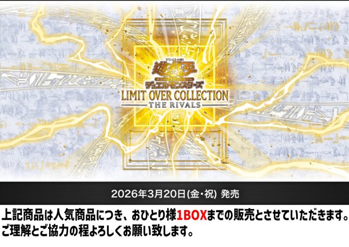 本日発売の遊戯王新弾 「LIMIT OVER COLLECTION-THERIVALS-」入荷しております! 新仕様「オーバーフレーム」登場!イラストがカード全面に描かれている特別仕様! もちろん買取も強化中!是非当店に…