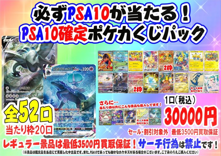 ポケカくじパック「PSA10確定くじパック」販売開始です! 1口30,000円、全52口! ポップに記載の豪華景品を20口封入しております!それ以外にもプチ豪華な景品が…!? さらにレギュラー景品は最低でも3500円で買…