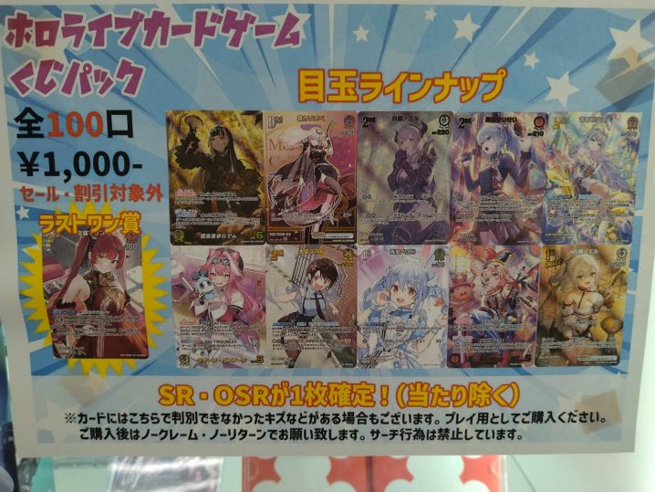 ホロライブOCGの1000円くじパックの販売を開始致しました! 全100口、SRもしくはOSRが1枚確定!(当たり除く) 当たりには豪華景品をご用意致しました! 最後の1パックをご購入の方にはラストワン賞もご用意! この…