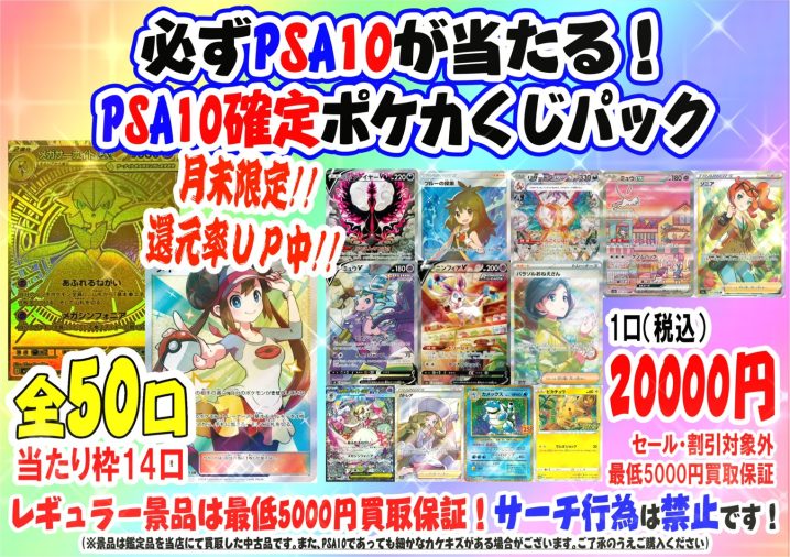 ポケカくじパック「PSA10確定くじパック」販売開始です! 1口20,000円、全50口! ポップに記載の当たり枠豪華景品は14口!今回は月末限定・還元率マシマシでご用意しております!!レギュラー景品は最低でも5000円…